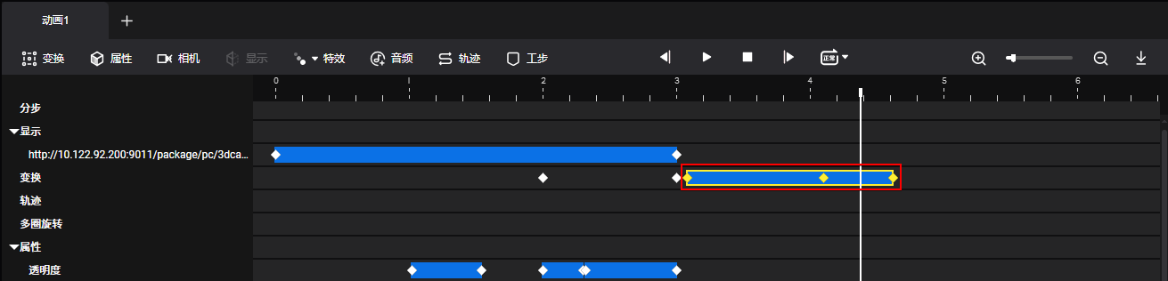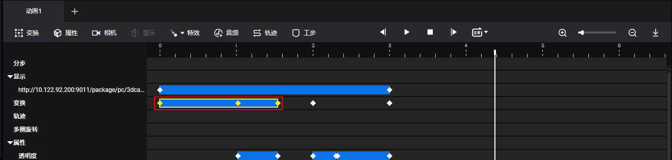 移动 功能说明:移动关键帧/关键帧组。 操作步骤: 在时间线区域,单击同一轨道上的单个关键帧或关键帧组。按住 Ctrl,可单击多选不相邻的关键帧或关键帧组。 Tip: 在轨道区域,按住鼠标中键并拖动,可一次性框选多个相邻的关键帧或关键帧组。 鼠标移动到高亮的某一个关键帧上,长按左键选中该关键帧,拖动即可移动该关键帧/关键帧组,如下图。