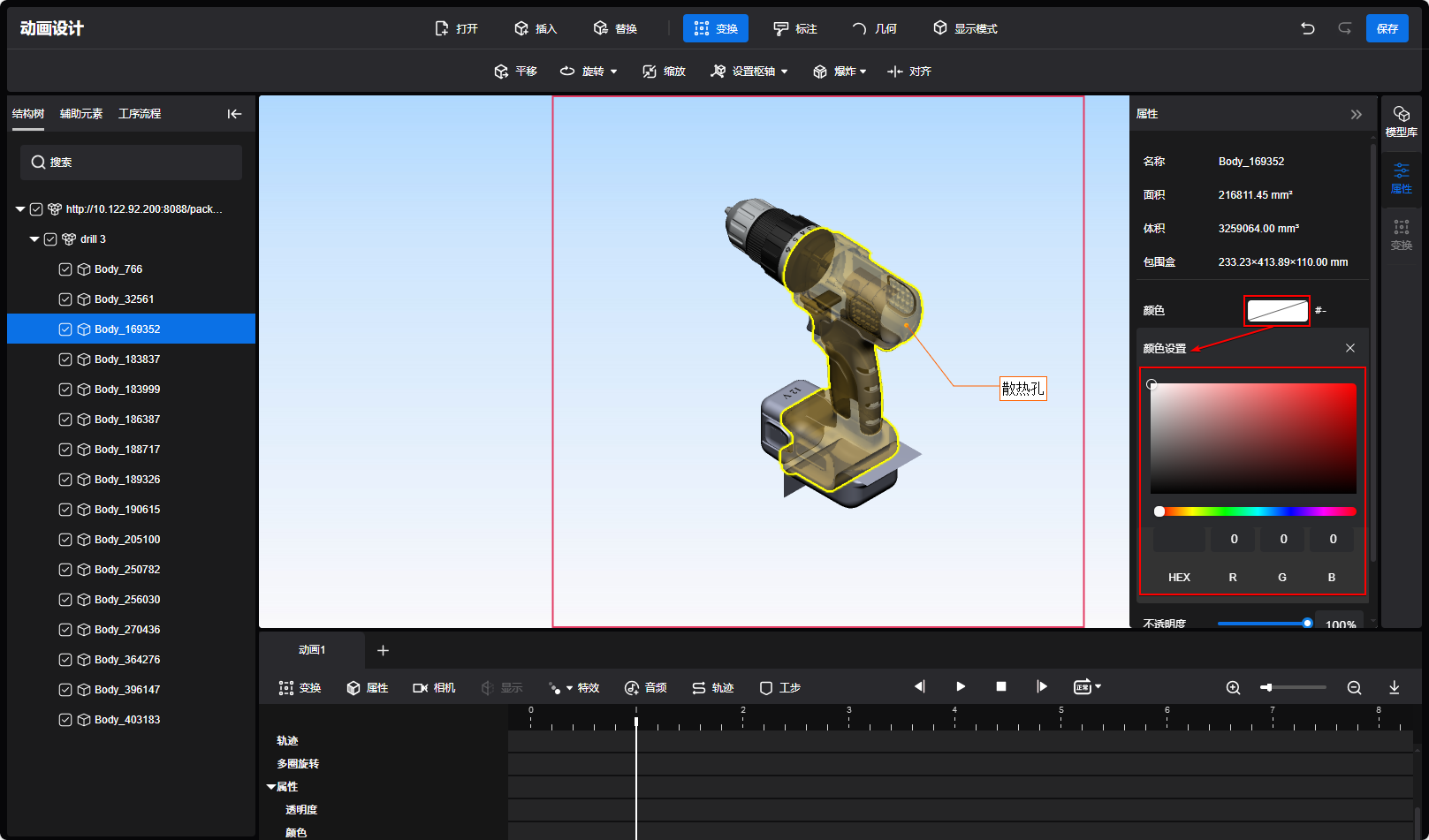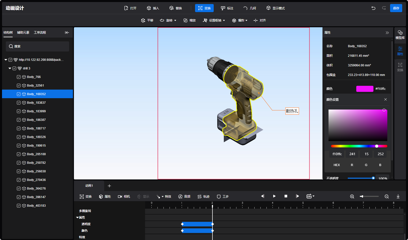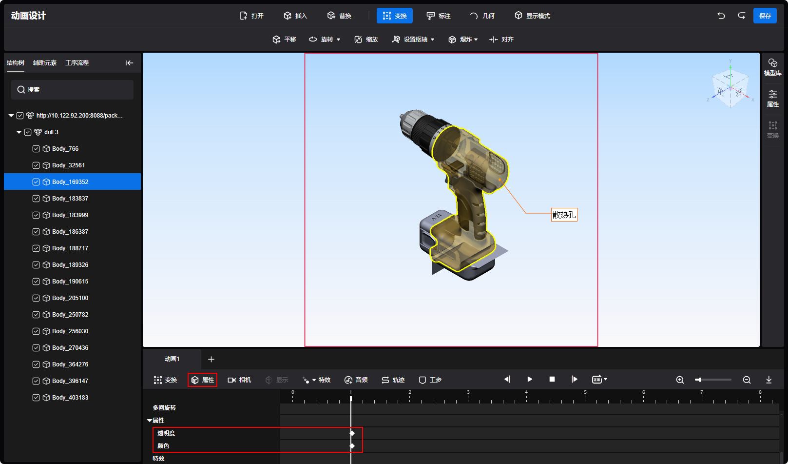 - 再次选中模型,单击时间线上的属性按钮(属性关键帧同步记录透明度和颜色关键帧),记录模型颜色,轨道新增颜色关键帧,如下图。