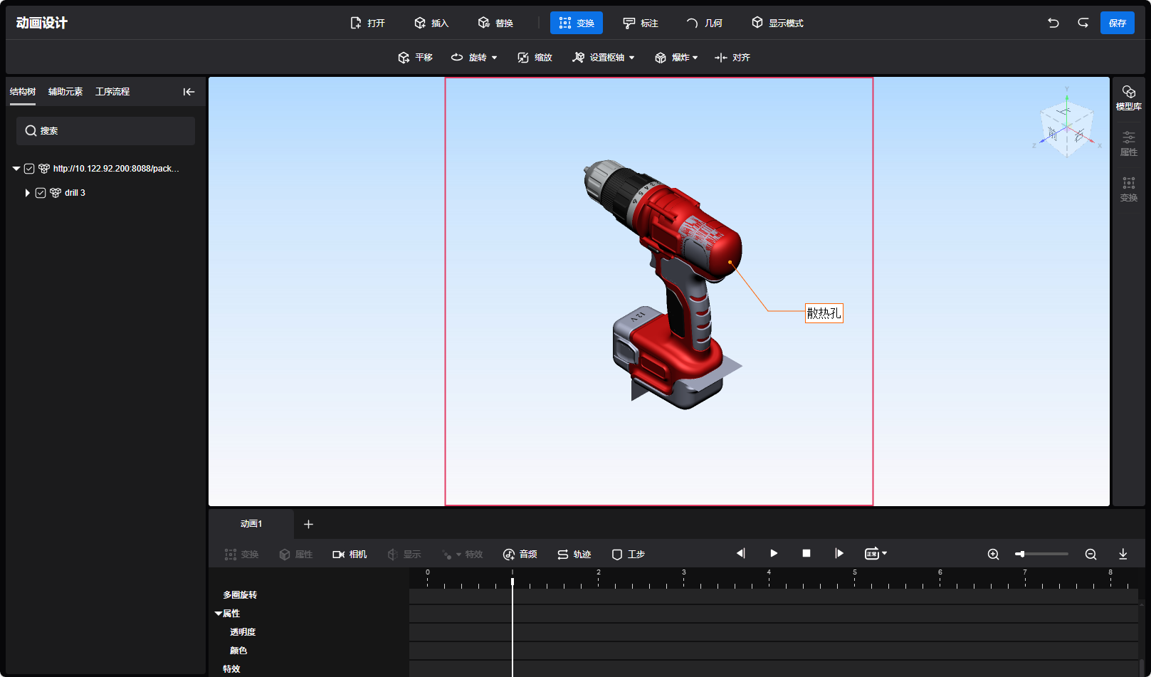 - 光标移动到视图区,左键单击选中模型,模型高亮。单击属性,属性窗格展开,显示当前模型属性信息,效果如下图。