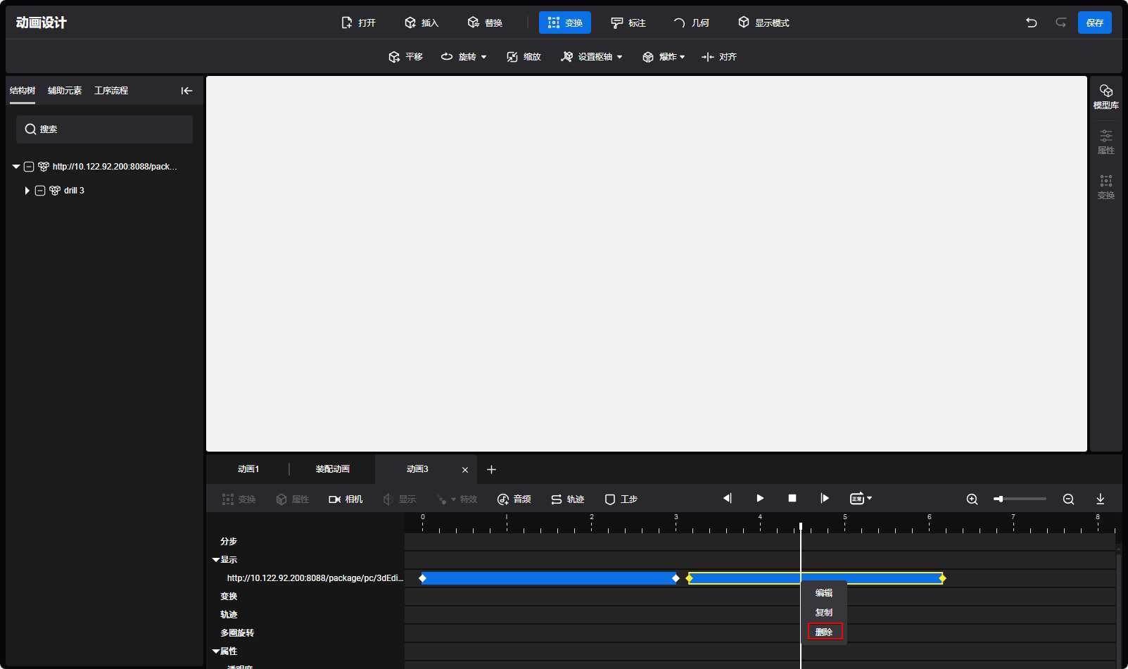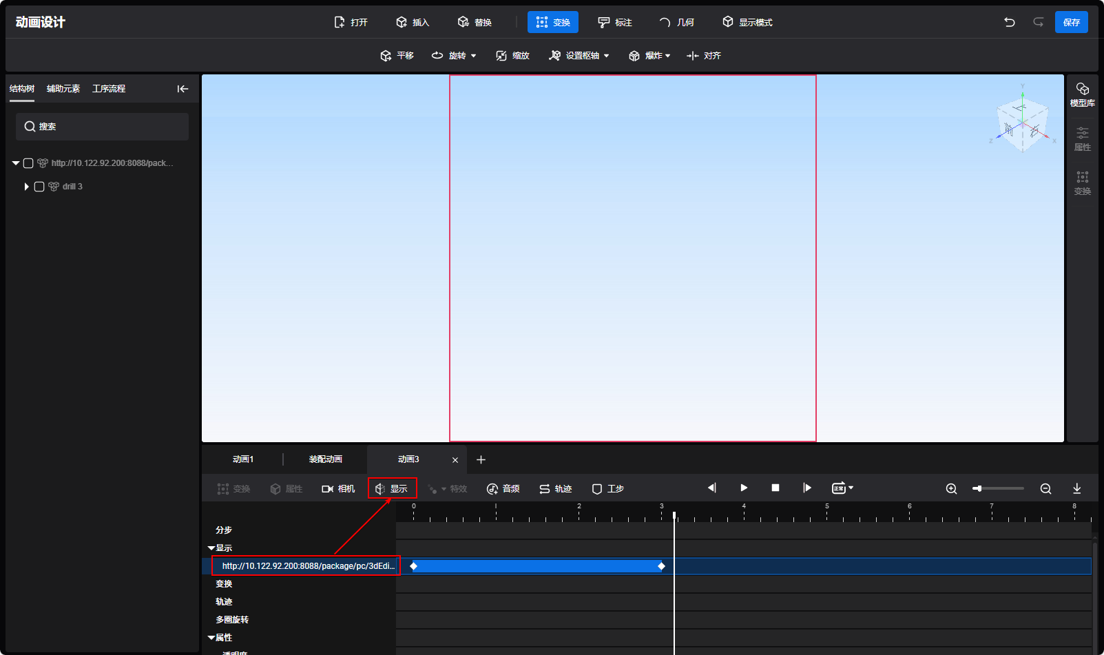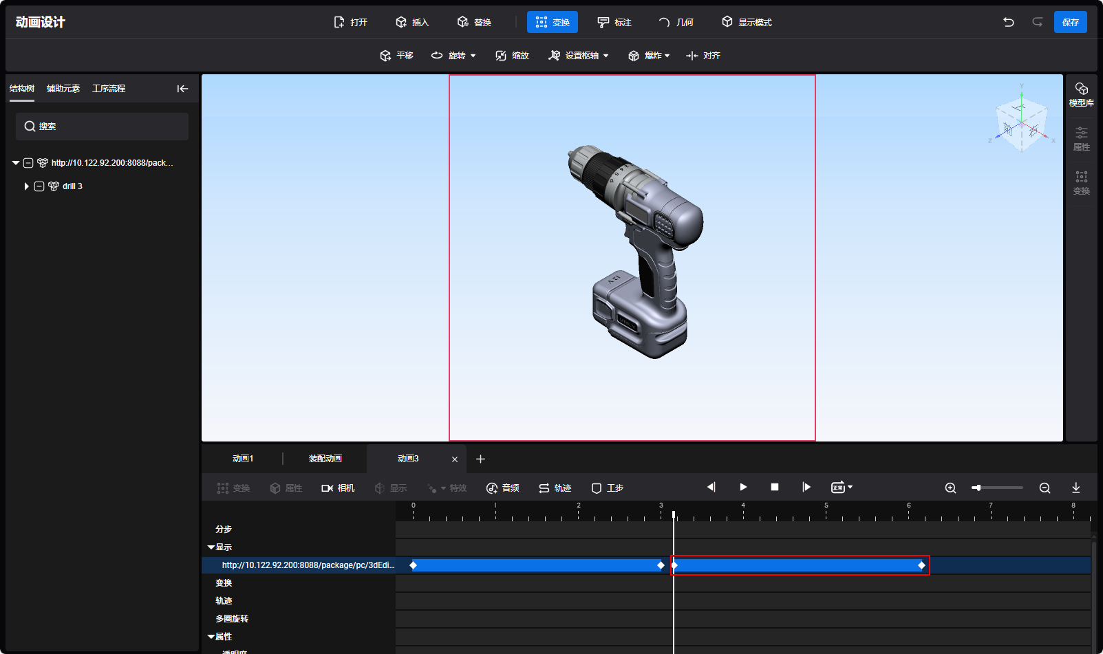 - 打开模型后会默认生成3秒的显隐动画块,播放头在显影动画块内,模型或标注显示在视图区域。显影块外对应模型或批注隐藏且无法操作。