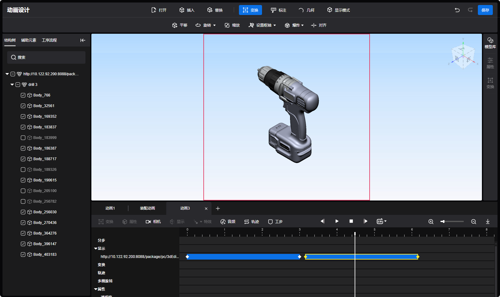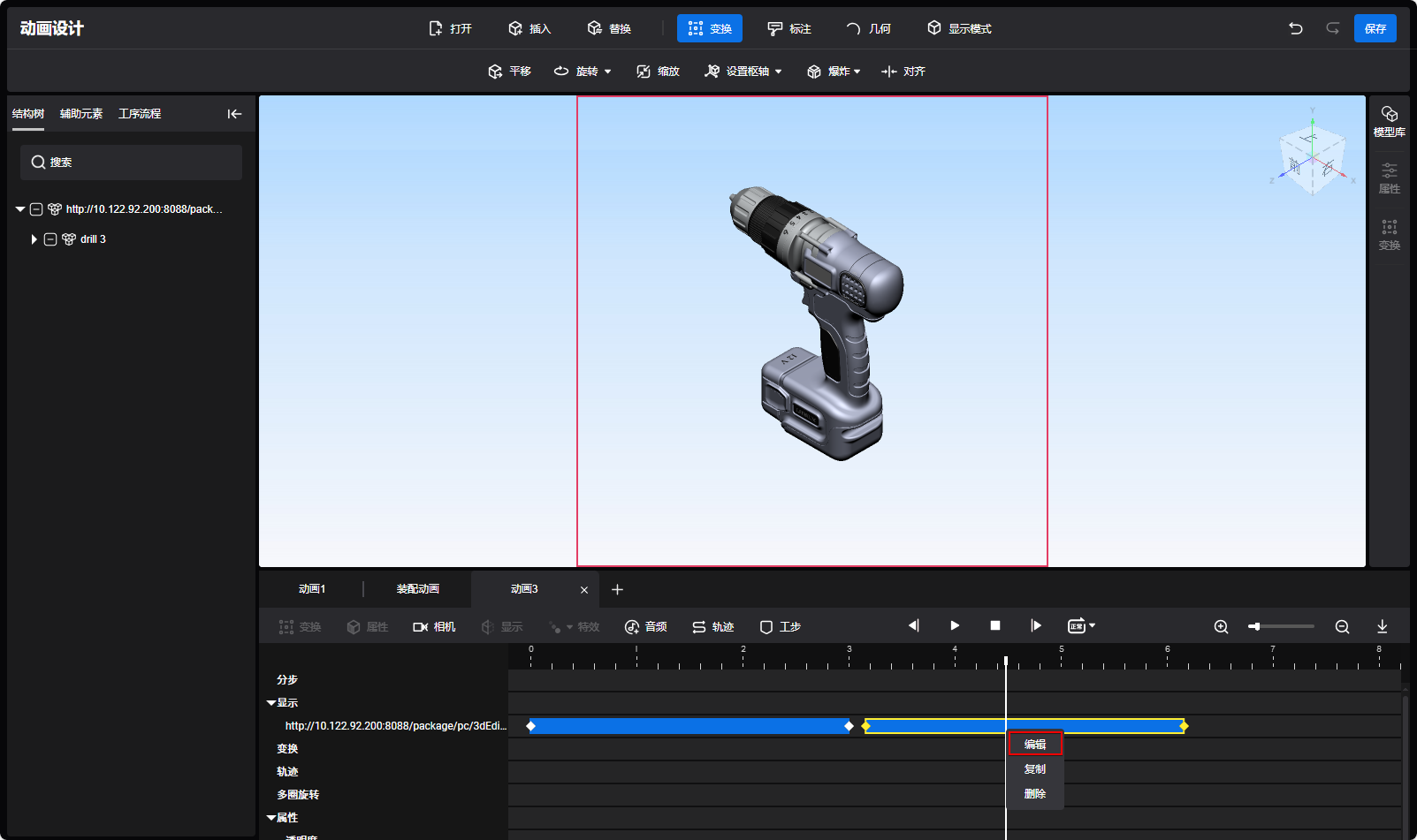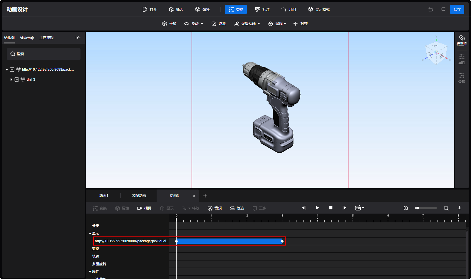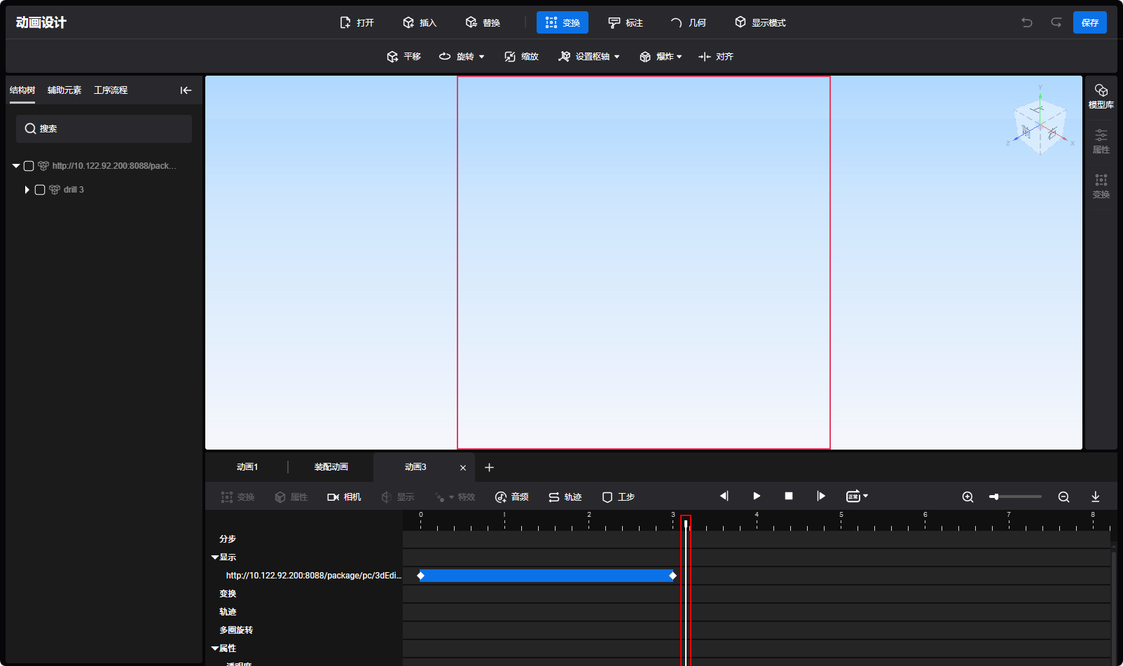 - 打开模型后会默认生成3秒的显隐动画块,播放头在显影动画块内,模型或标注显示在视图区域。显影块外对应模型或批注隐藏且无法操作。