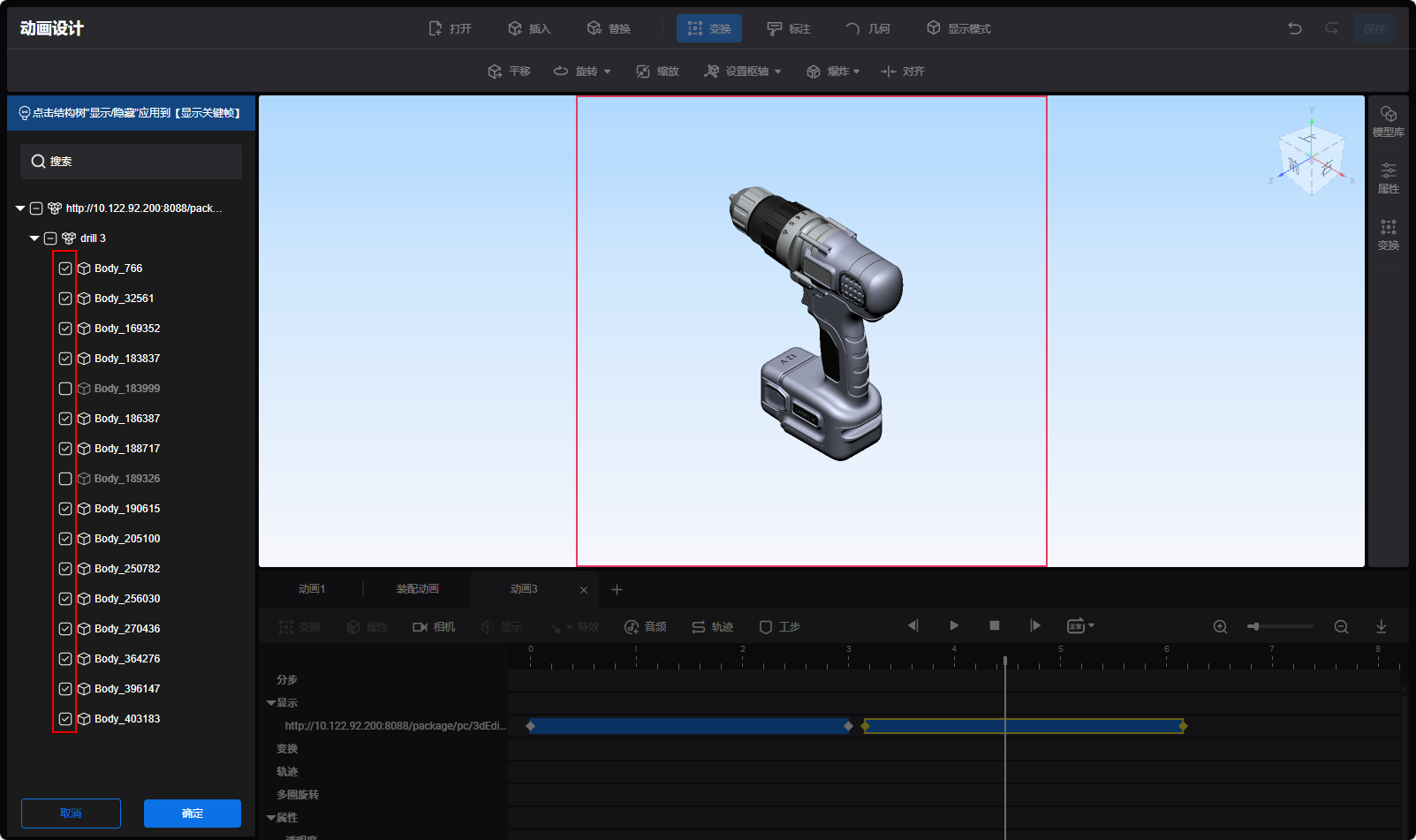 - 单击确定。选中的显影动画块内的模型将按照新的显影逻辑进行显示 。