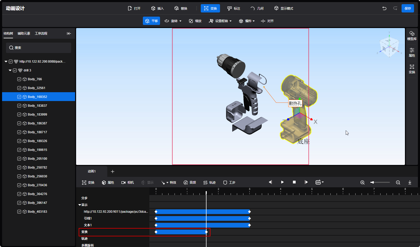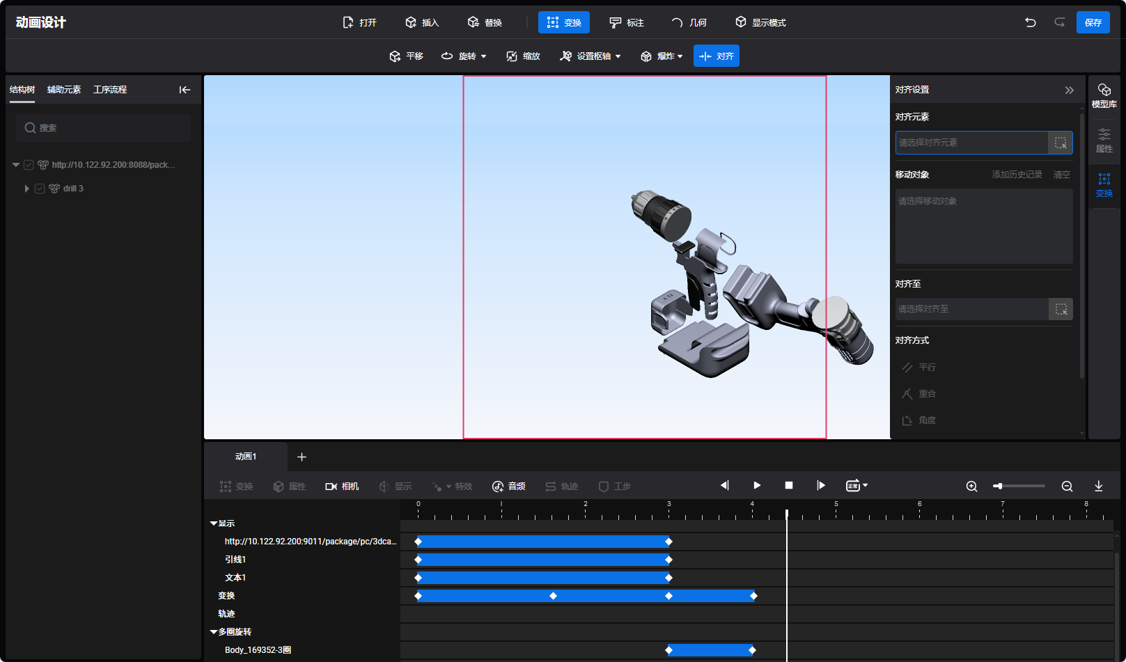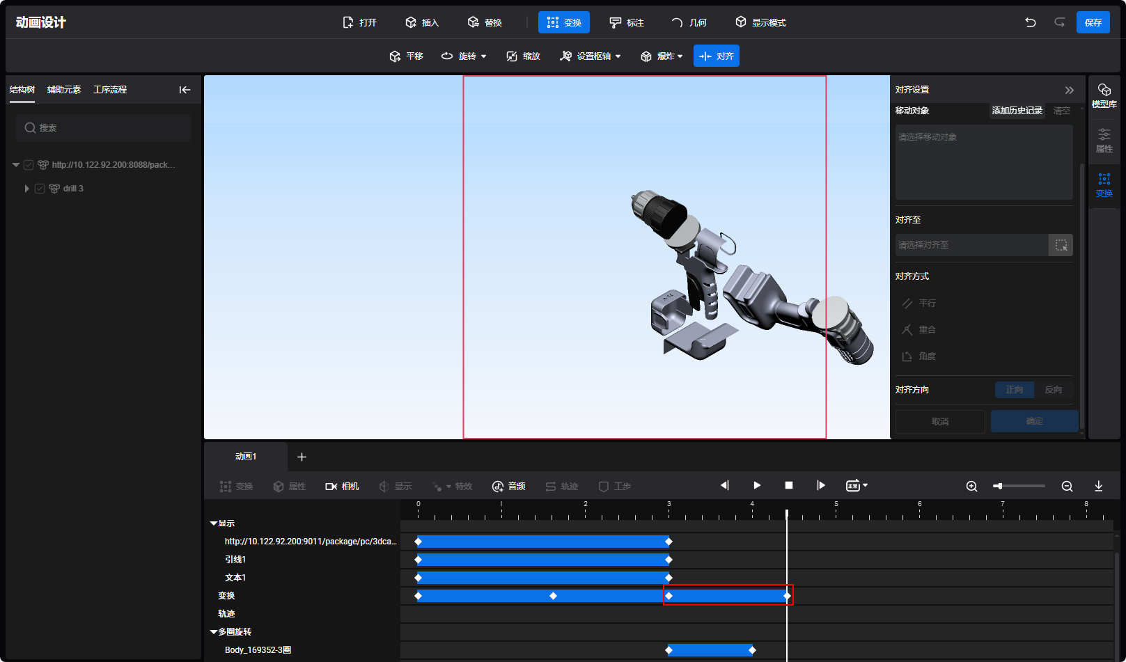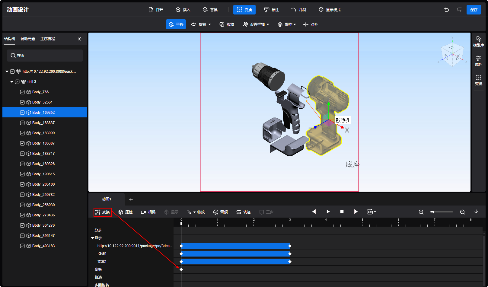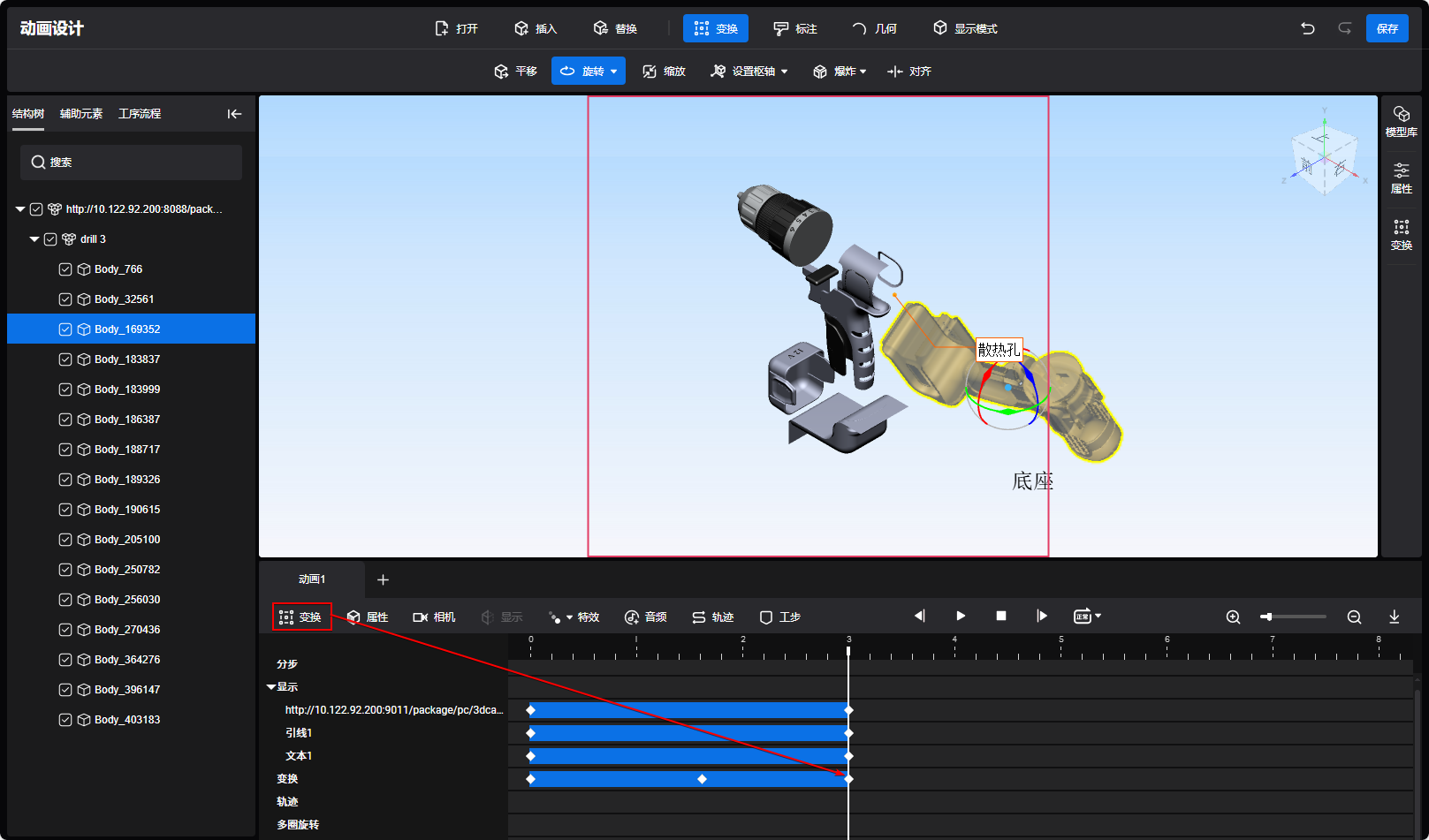 功能说明:变换动画可以通过平移、旋转、对齐、缩放等操作,改变模型和标注的位置和姿态,通过添加变换关键帧记录状态,补间出关键帧之间的位置和姿态,形成变换动画。