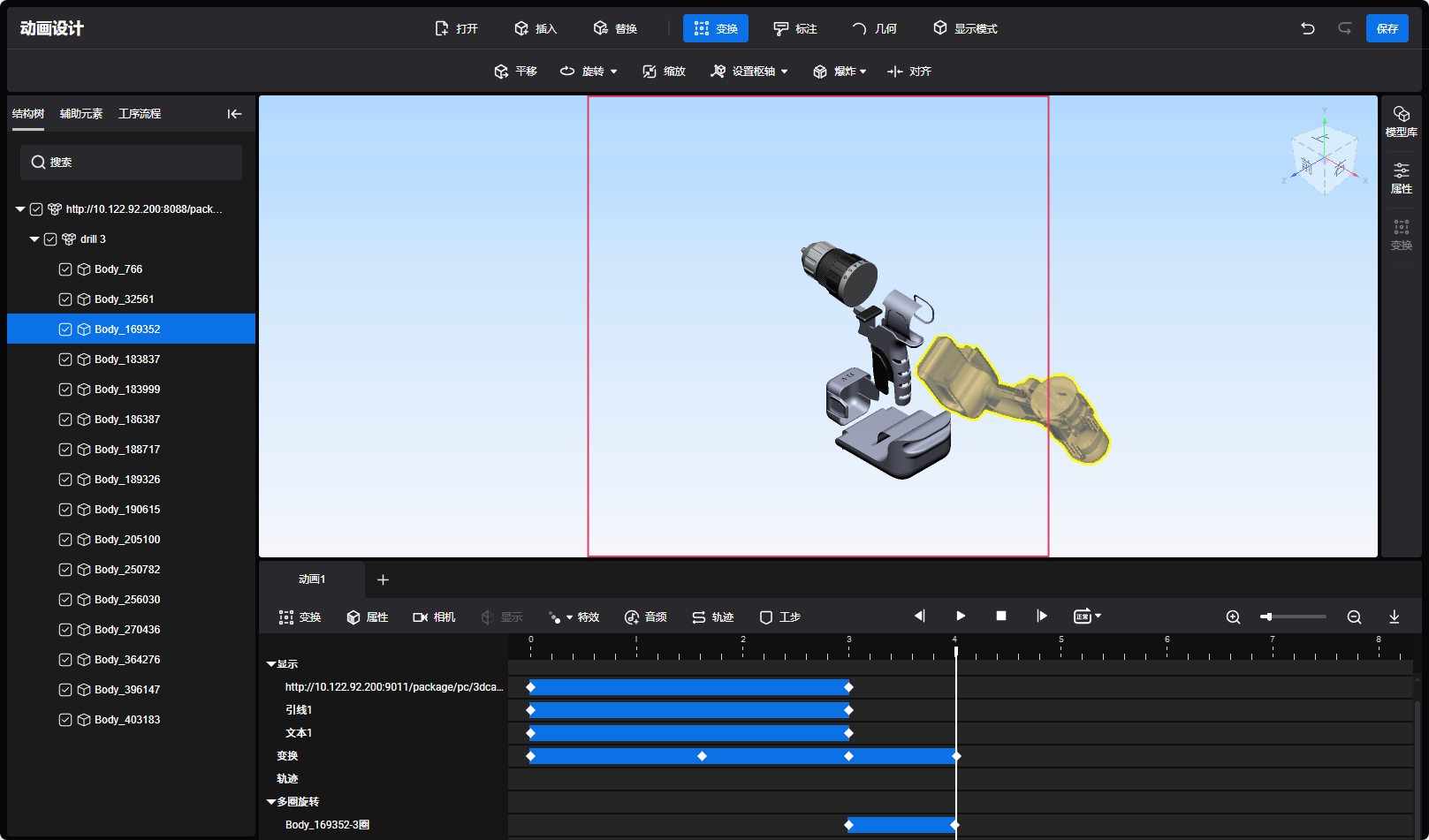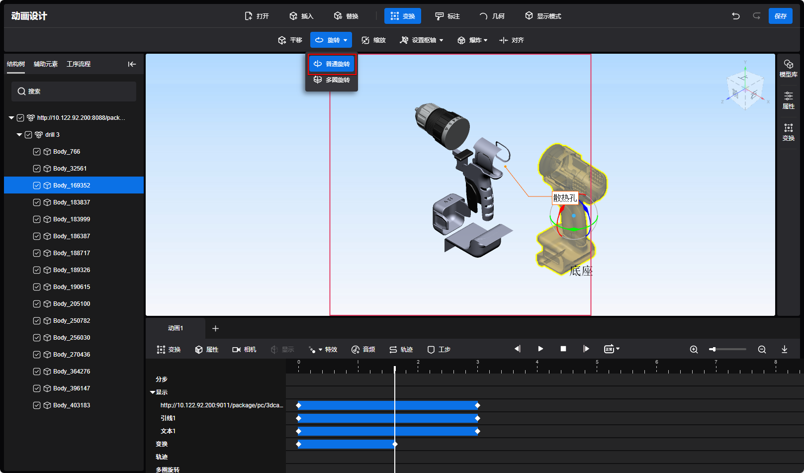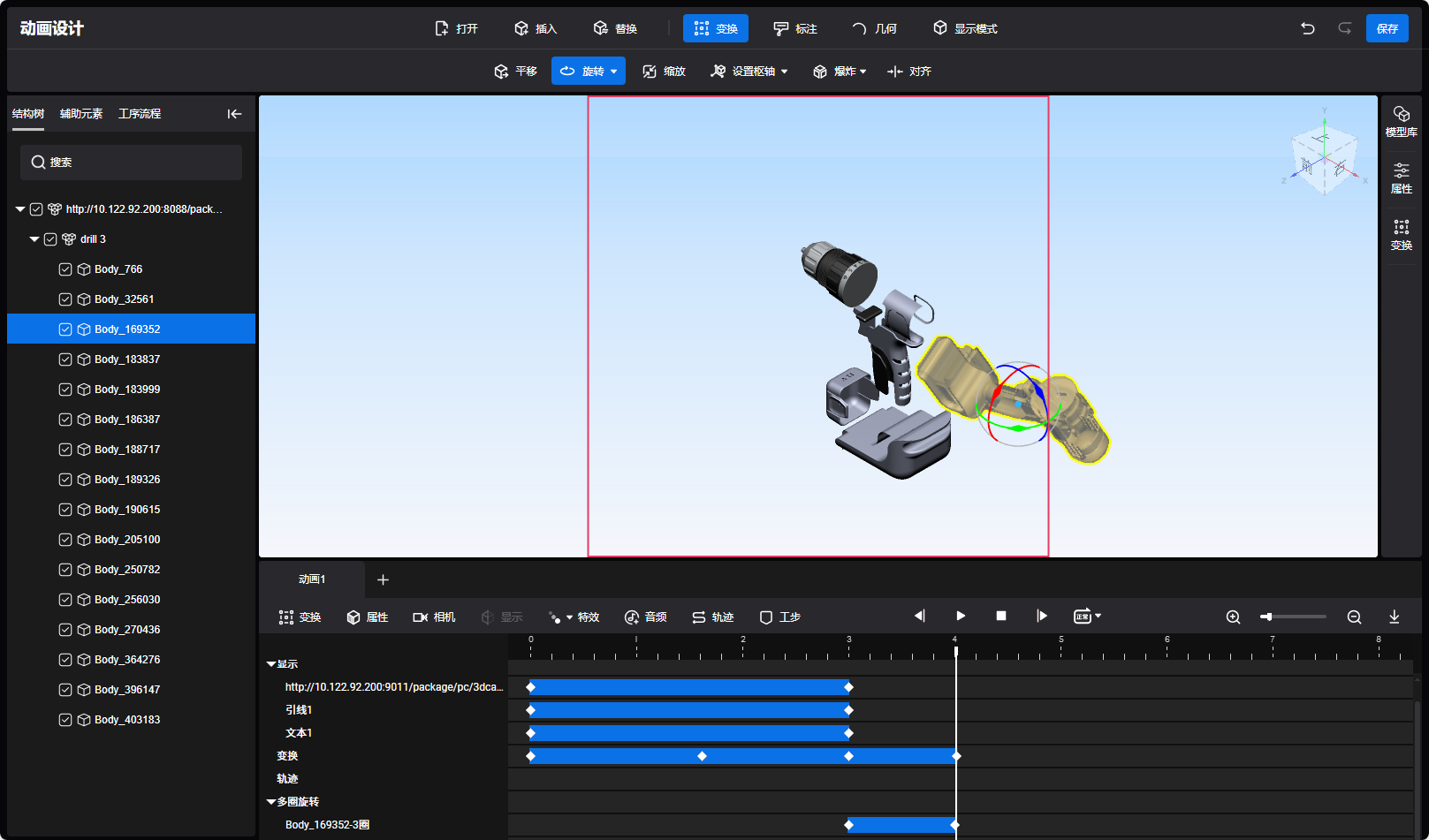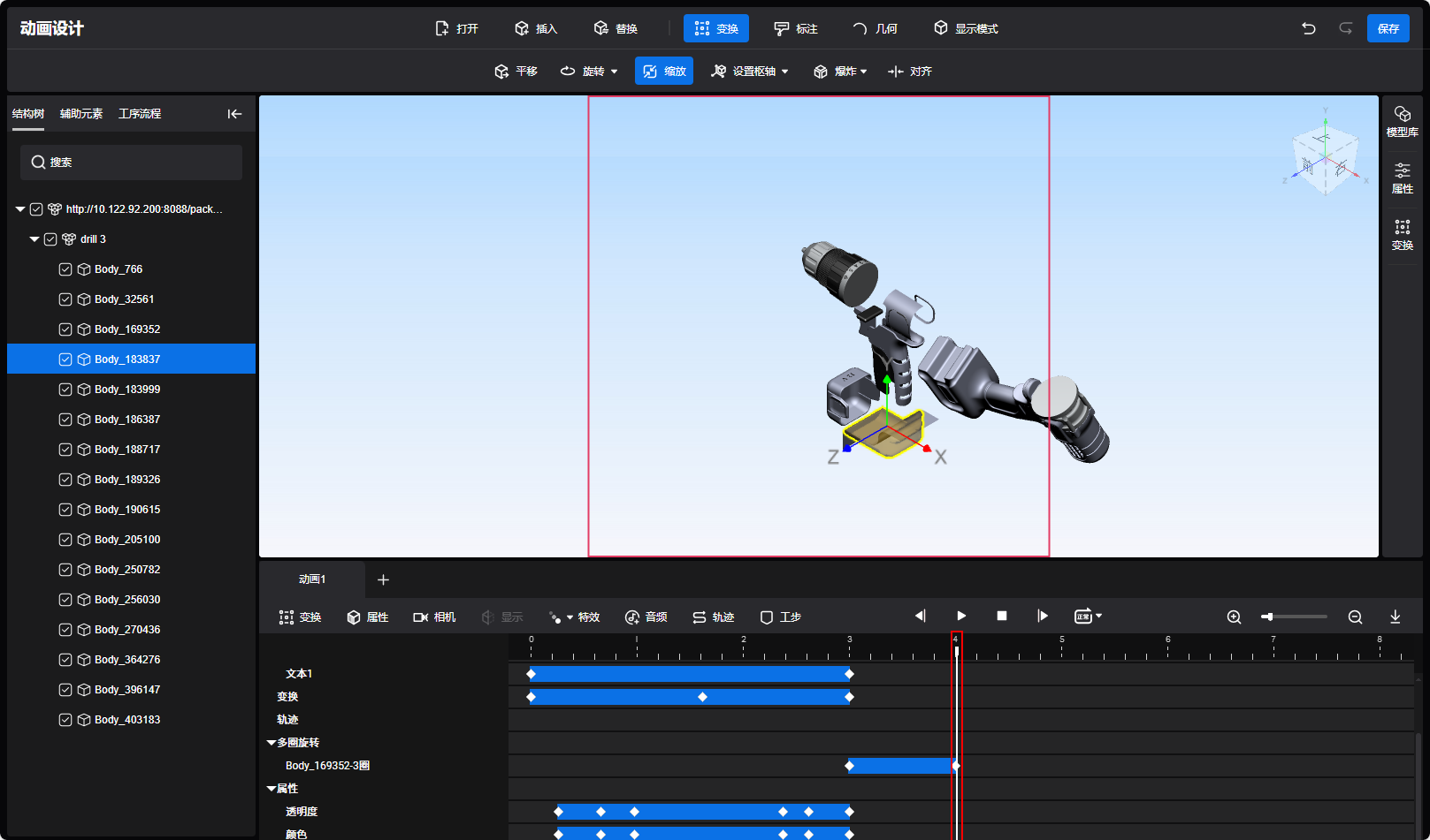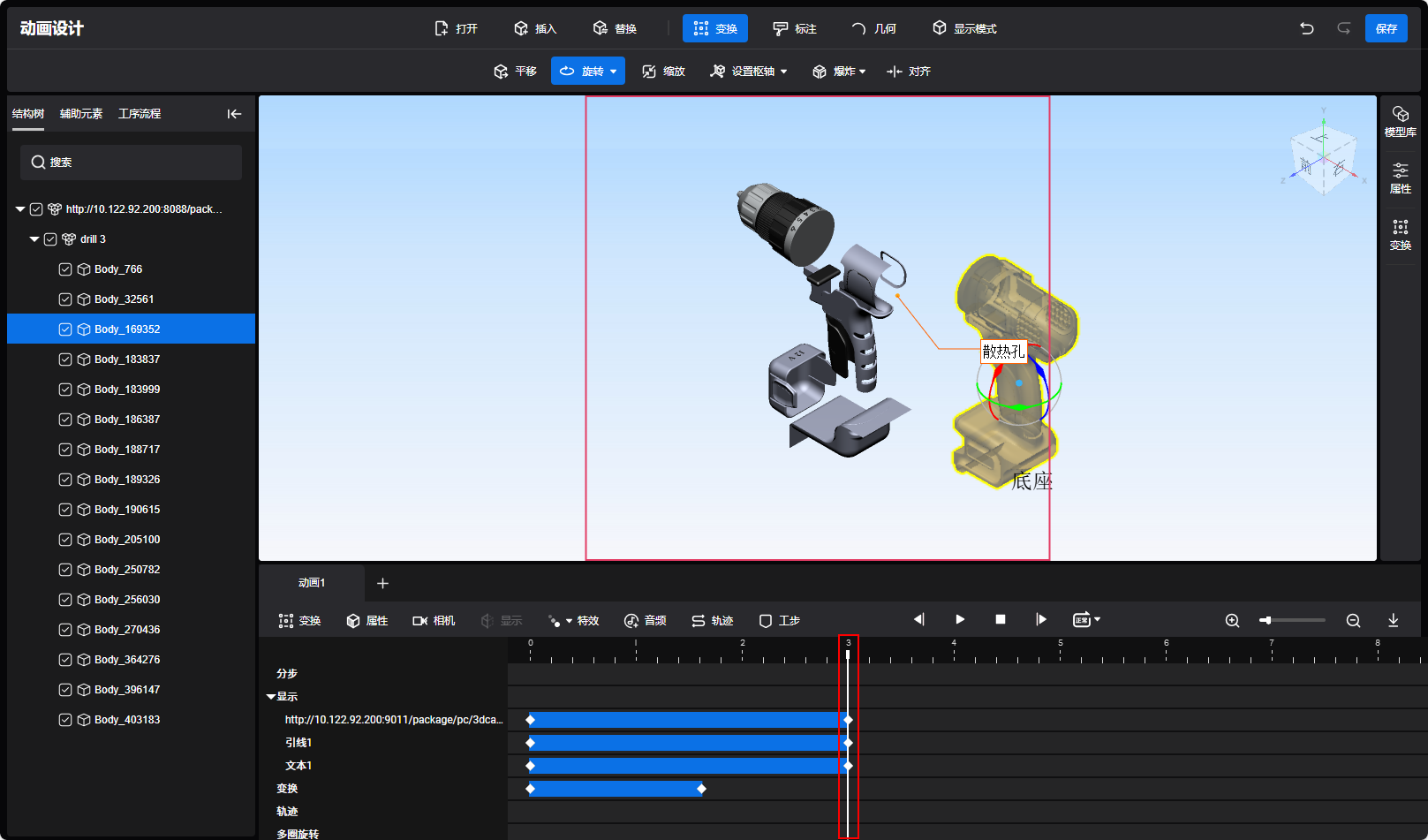 功能说明:变换动画可以通过平移、旋转、对齐、缩放等操作,改变模型和标注的位置和姿态,通过添加变换关键帧记录状态,补间出关键帧之间的位置和姿态,形成变换动画。