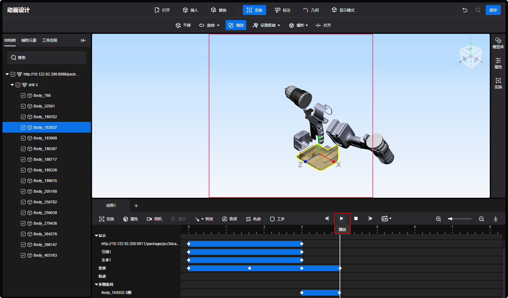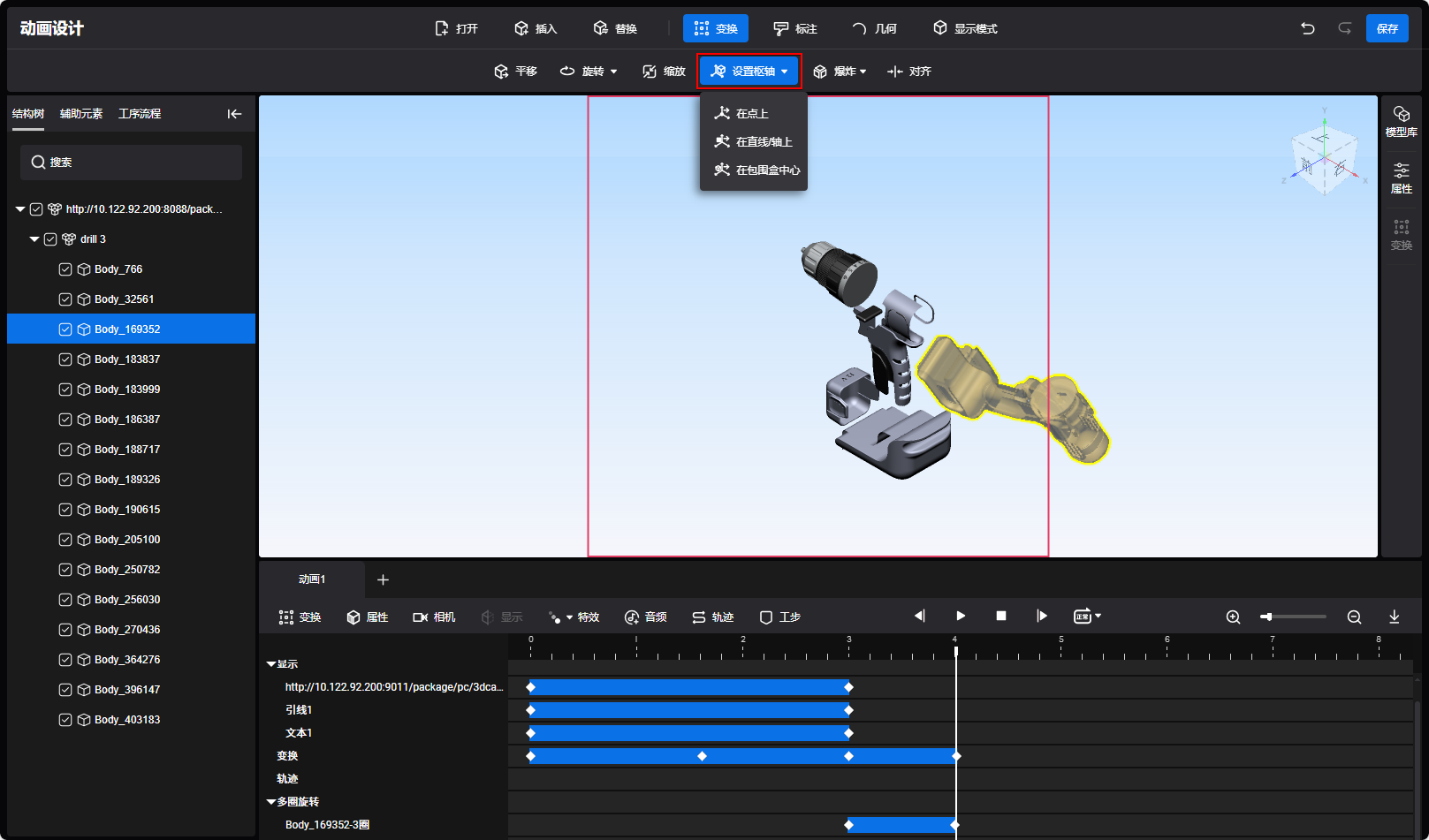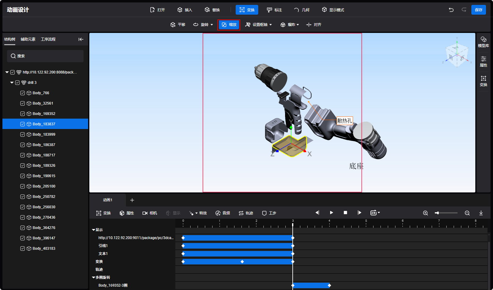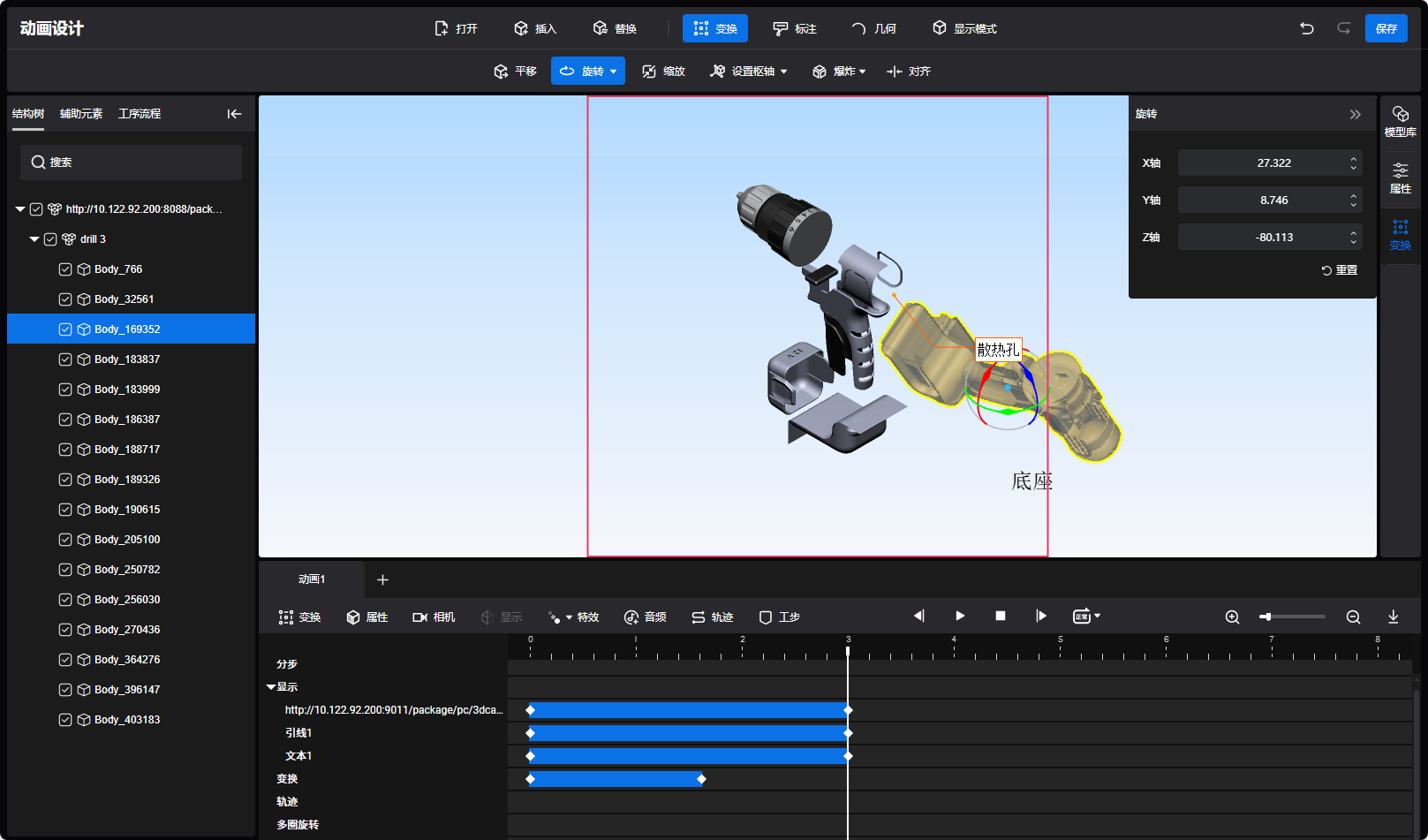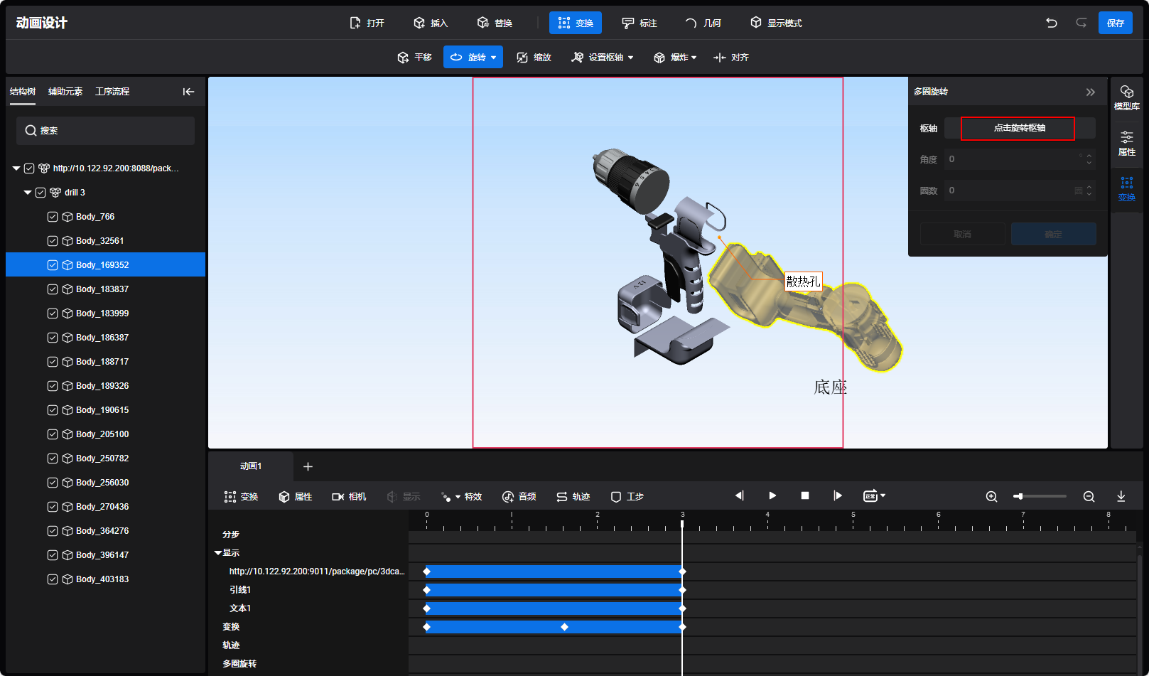 功能说明:变换动画可以通过平移、旋转、对齐、缩放等操作,改变模型和标注的位置和姿态,通过添加变换关键帧记录状态,补间出关键帧之间的位置和姿态,形成变换动画。