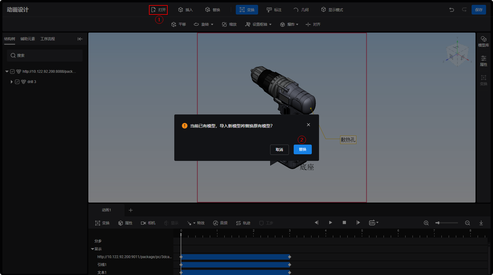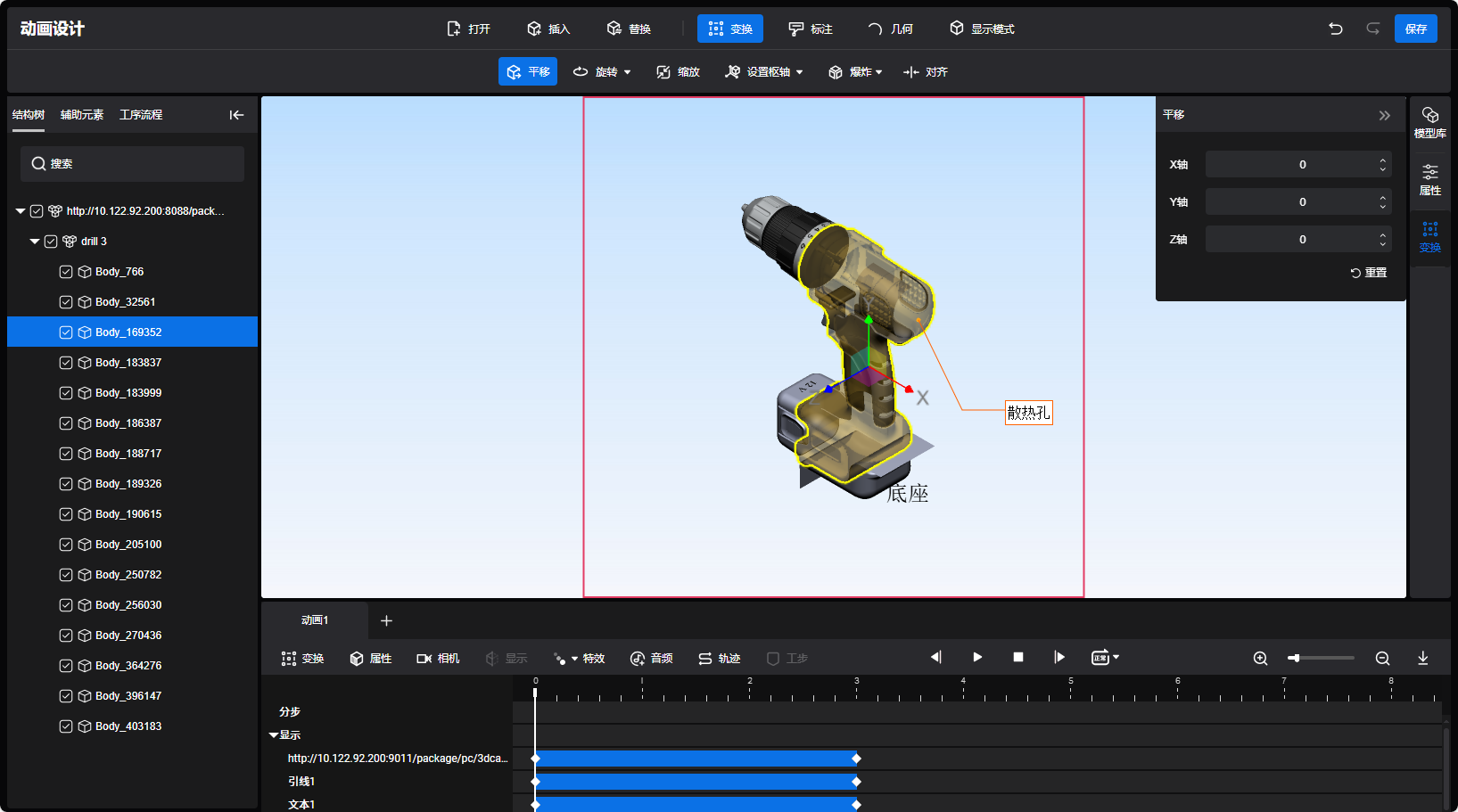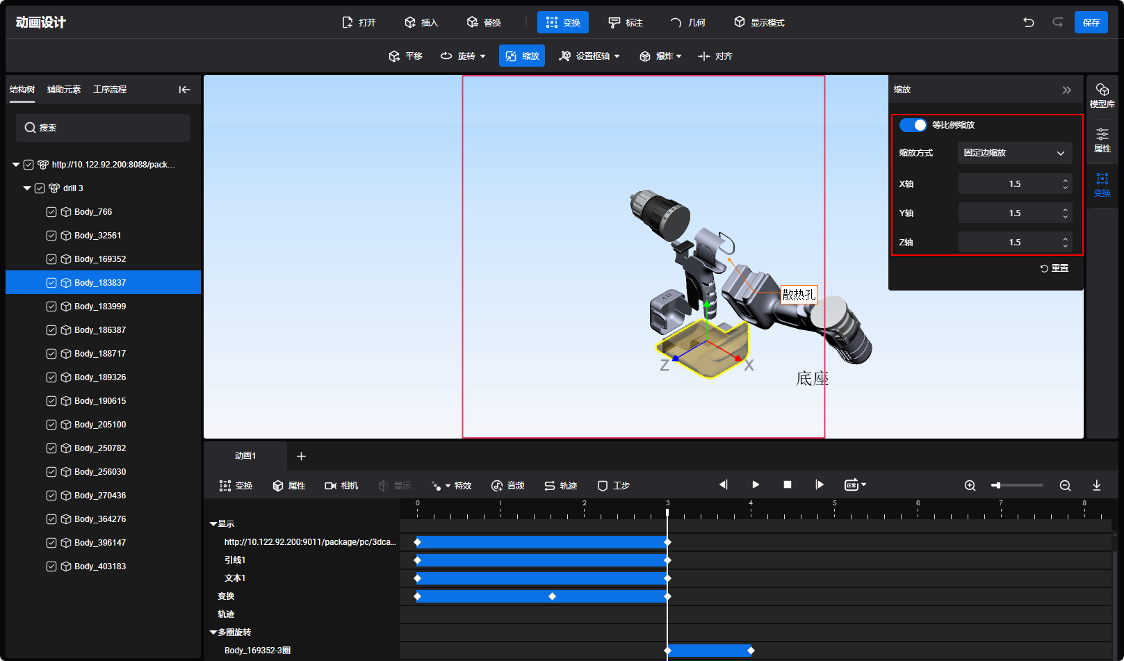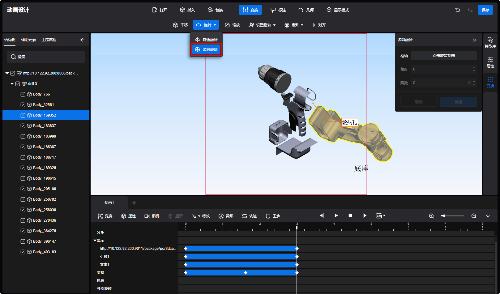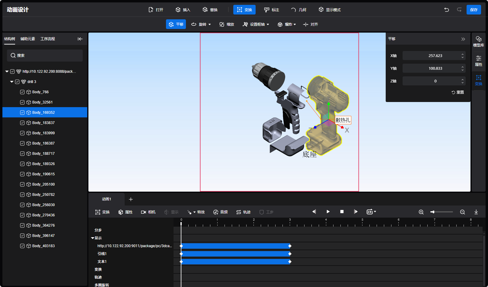 功能说明:变换动画可以通过平移、旋转、对齐、缩放等操作,改变模型和标注的位置和姿态,通过添加变换关键帧记录状态,补间出关键帧之间的位置和姿态,形成变换动画。