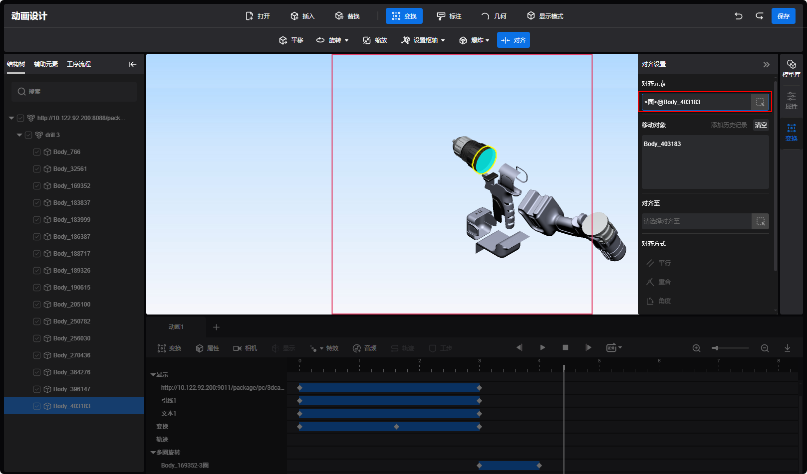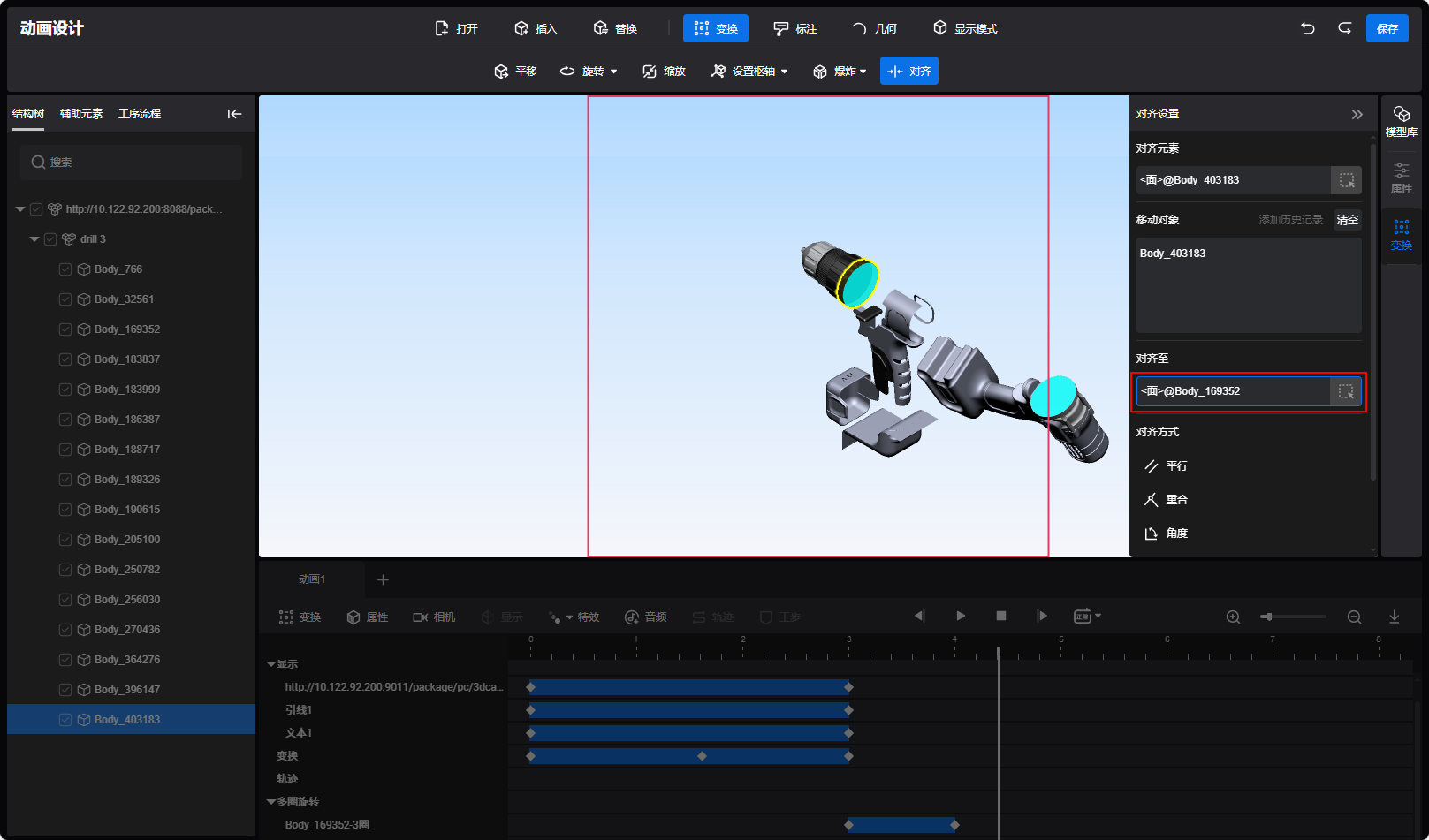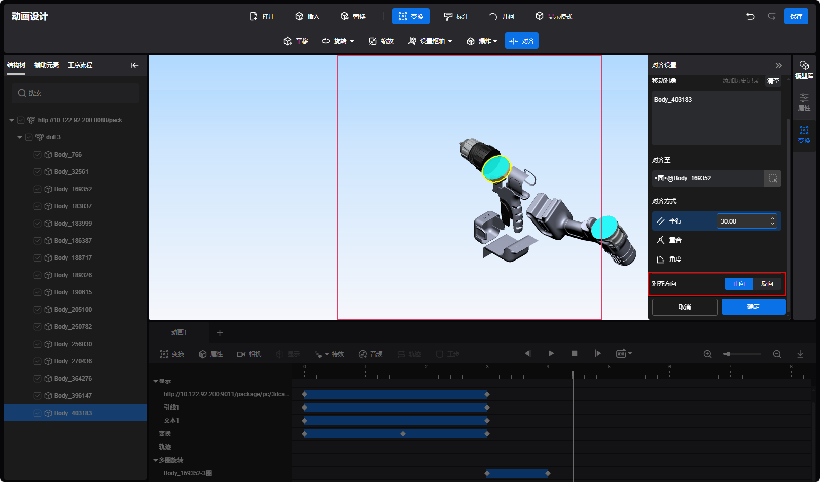 功能描述:使用对齐变换功能,可以在单个模型的不同零部件之间或多个模型之间创建精确的平行、重合、角度对齐的位置动画效果。创建平行对齐时,还可以指定平行间距,使得对齐的对象处于空间中的特定位置。