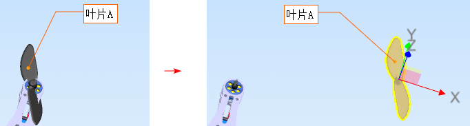 - 将光标移动到操作球任意轴上,轴会高亮显示。按住轴不放,拖动鼠标,模型组件会跟随旋转,如下图。