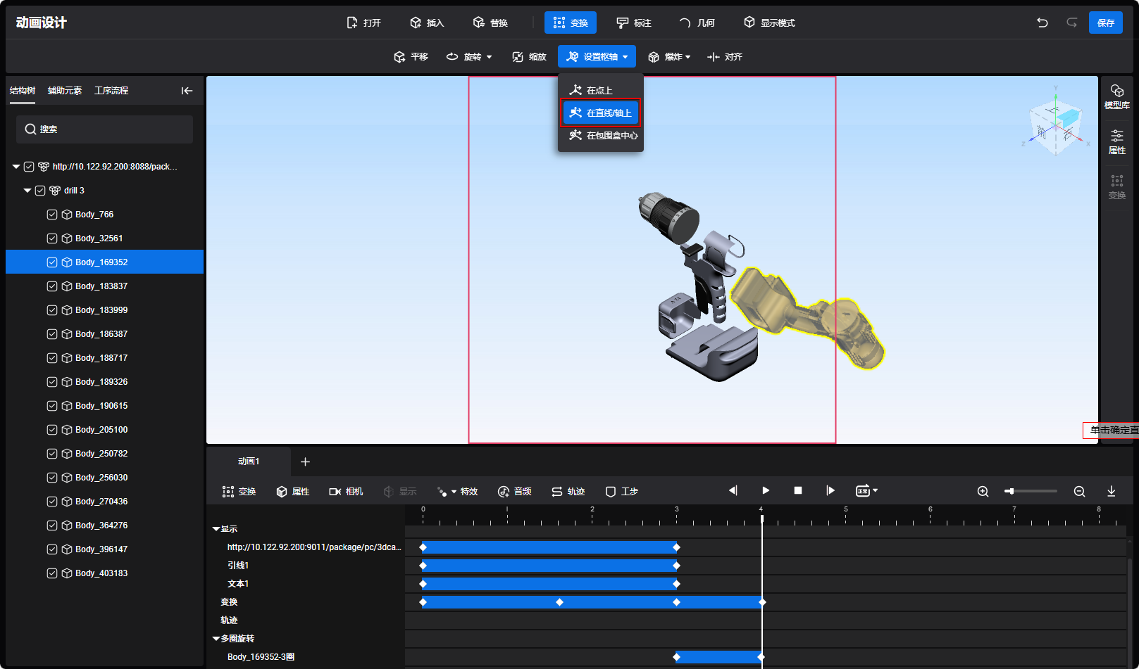- 在视图区,单击模型任意组件,模型高亮后,在工具栏单击,此时,设置枢轴下拉弹窗区高亮,选择在直线/轴上选项,如下图。