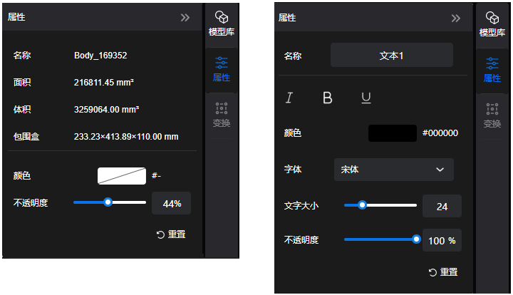 属性窗格 属性窗格位于视图区域的右侧。 当在左窗格选定一个或多个元素时,单击属性窗格,可查看和修改它的属性信息,例如颜色、不透明度、字体等,如下图: 窗格中图标的含义如下表: 图标 名称 描述 重置 恢复到初始设置 收起 收起面板