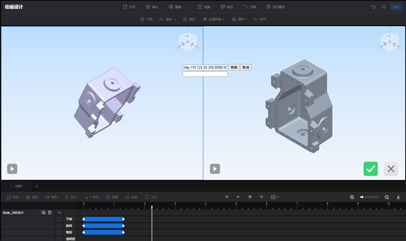- 替换完成后,系统将通过零件层级关系与坐标定位,自动识别新、旧模型文件的相同部分,并保留未更新部分已设置的动画。