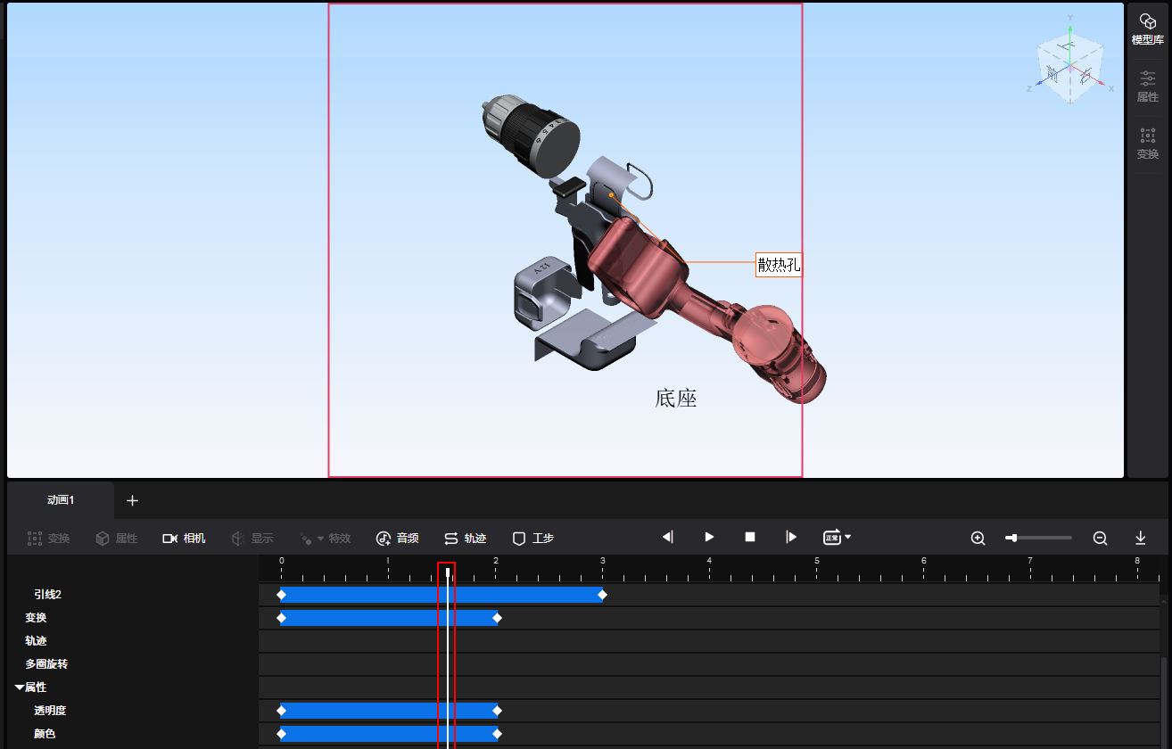功能说明:在动画创建后,如果您希望编辑处于共用关键帧或动画块中的部分零件的动画,则使用轨道拆分功能为这些零件单独设置不同的变换,包括平移、旋转、透明度、颜色等。