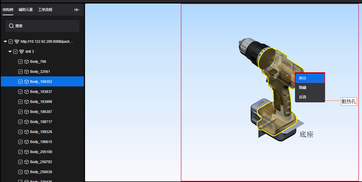 - 在视图区,选择需要单独编辑动画的零件,按住Ctrl键可多选。然后右键单击并选择拆分。
