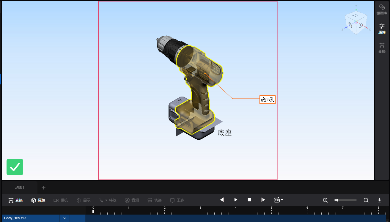 - 在时间线图层区域,选中一个零件对象,视图区域和结构树会高亮显示对应的零件,如下图所示。