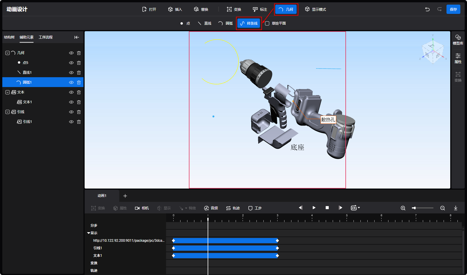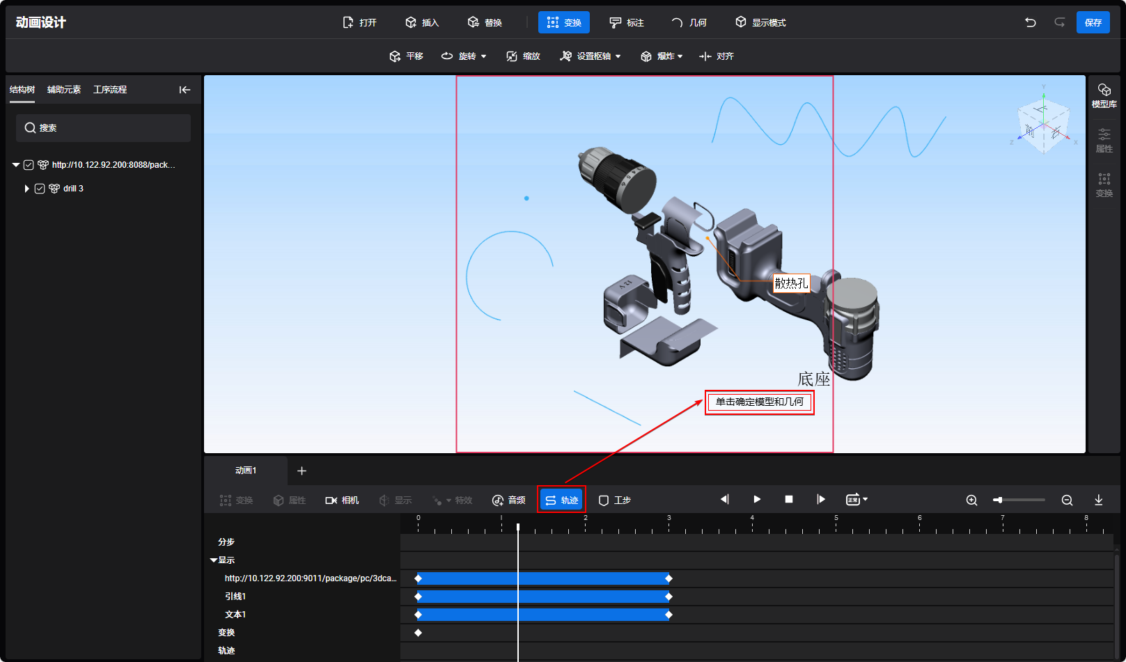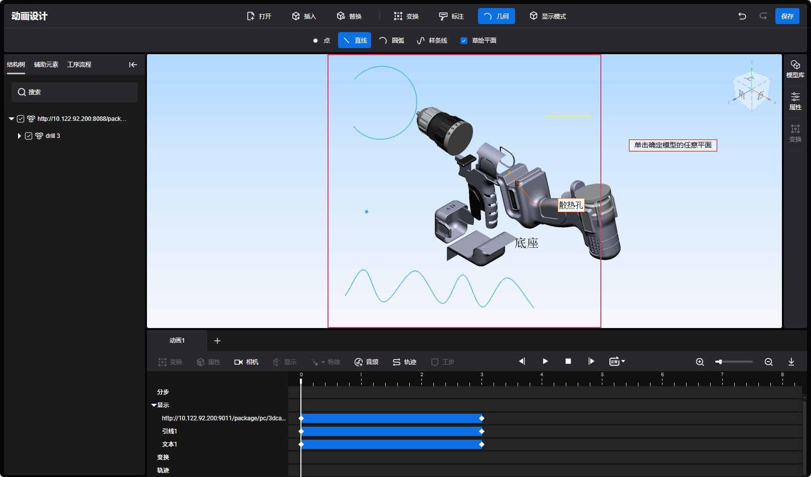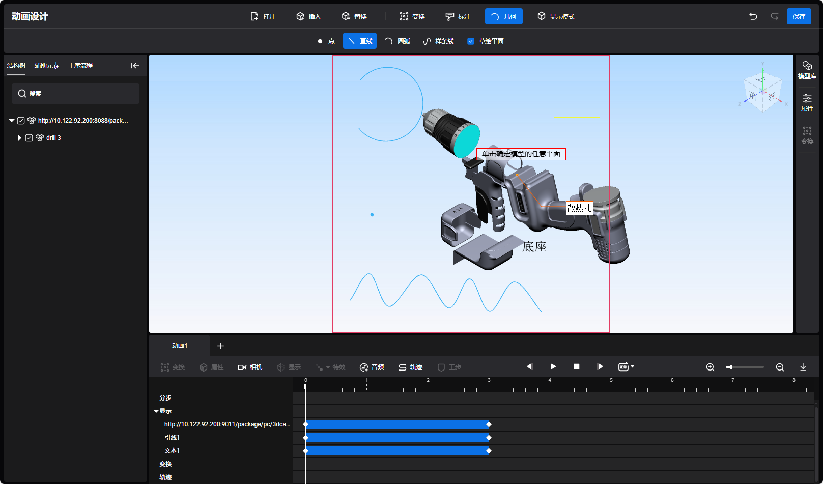 - 轨迹动画即模型根据视图区绘制的几何轨迹移动,支持直线、圆弧、样条线等轨迹操作。