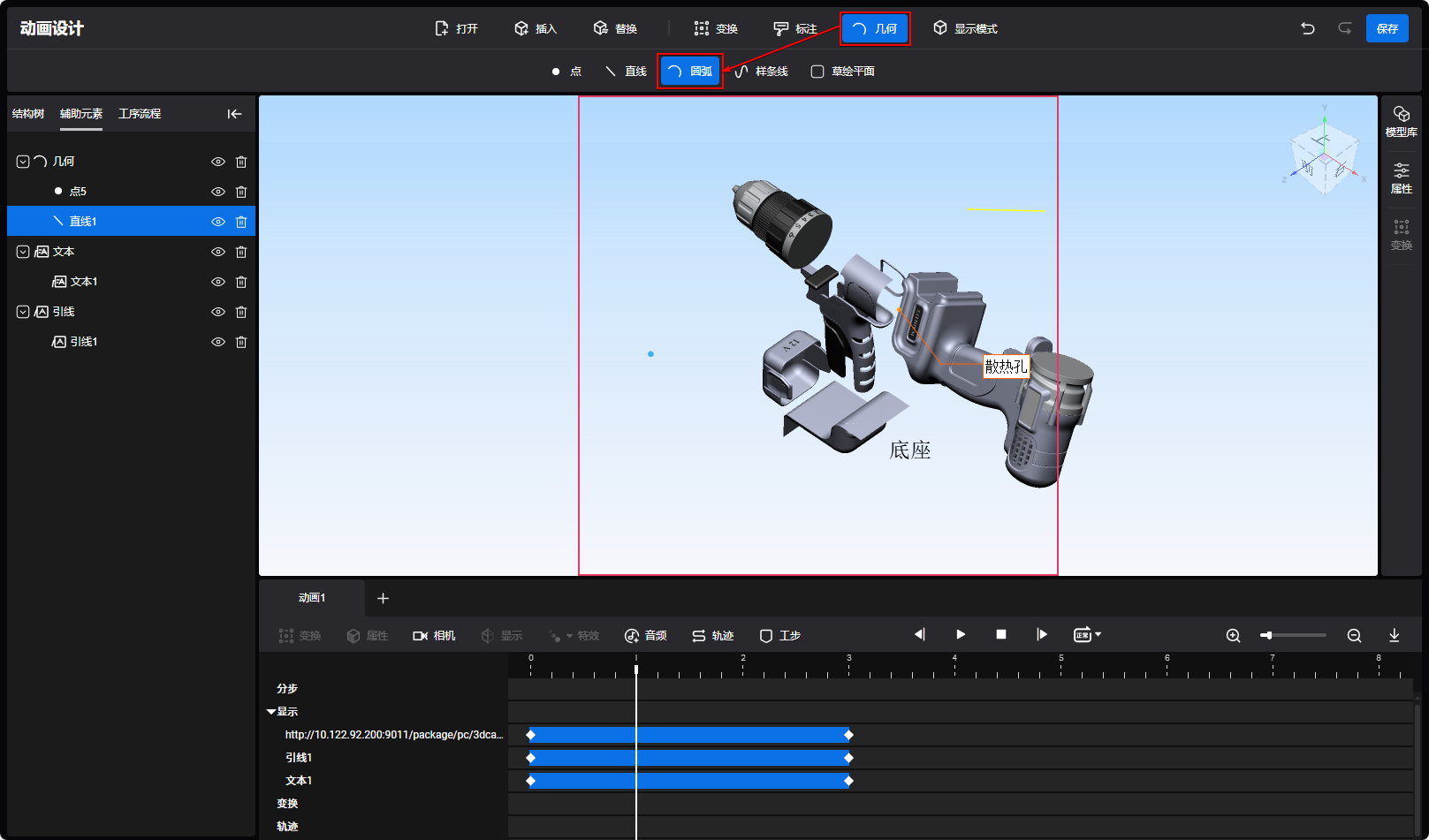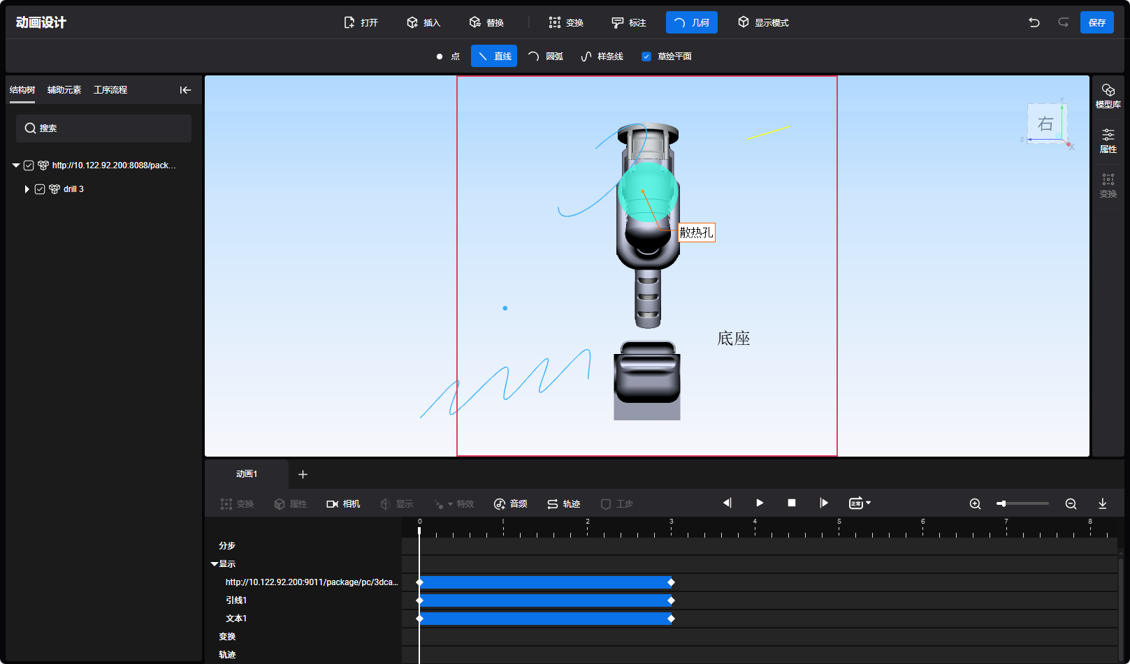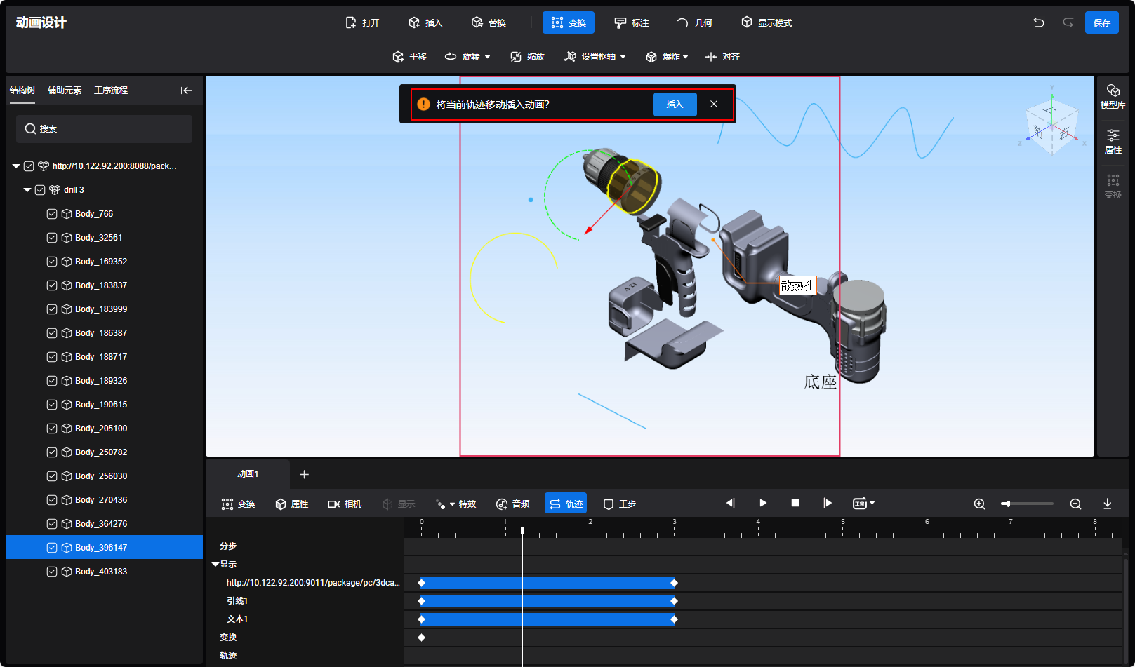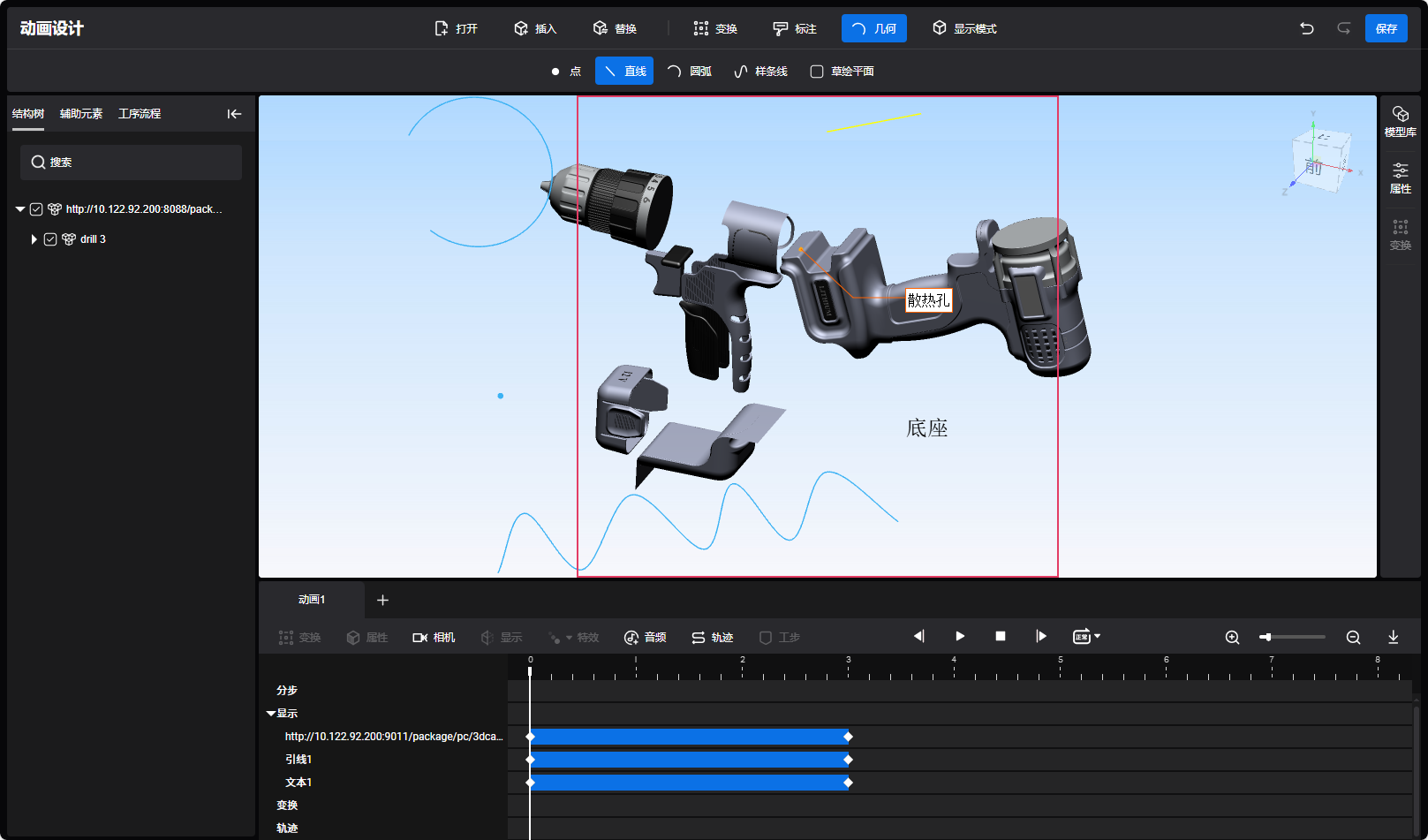 - 轨迹动画即模型根据视图区绘制的几何轨迹移动,支持直线、圆弧、样条线等轨迹操作。