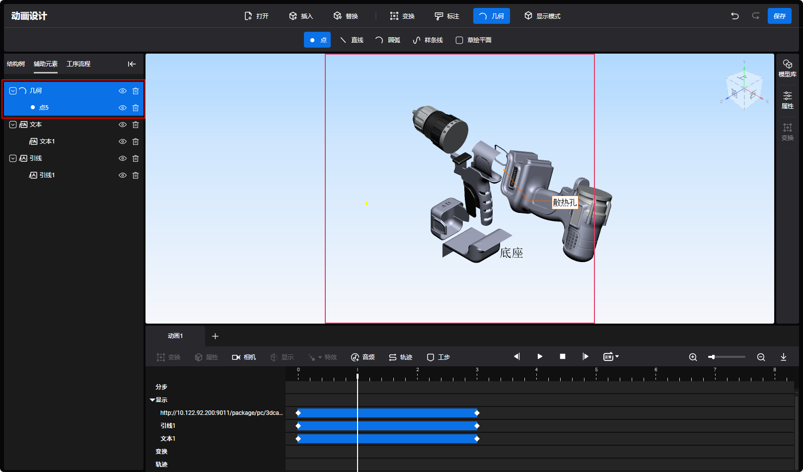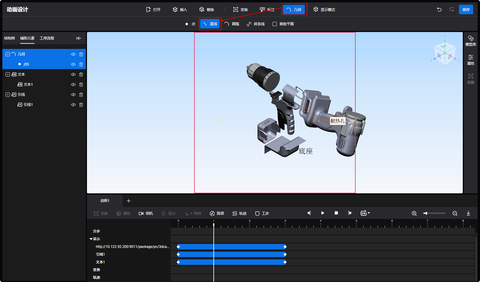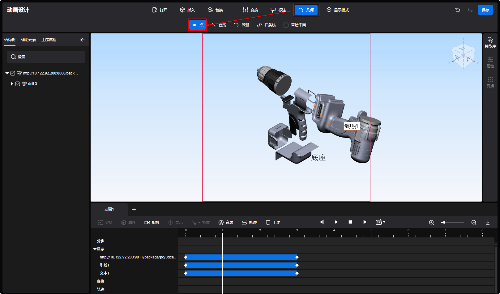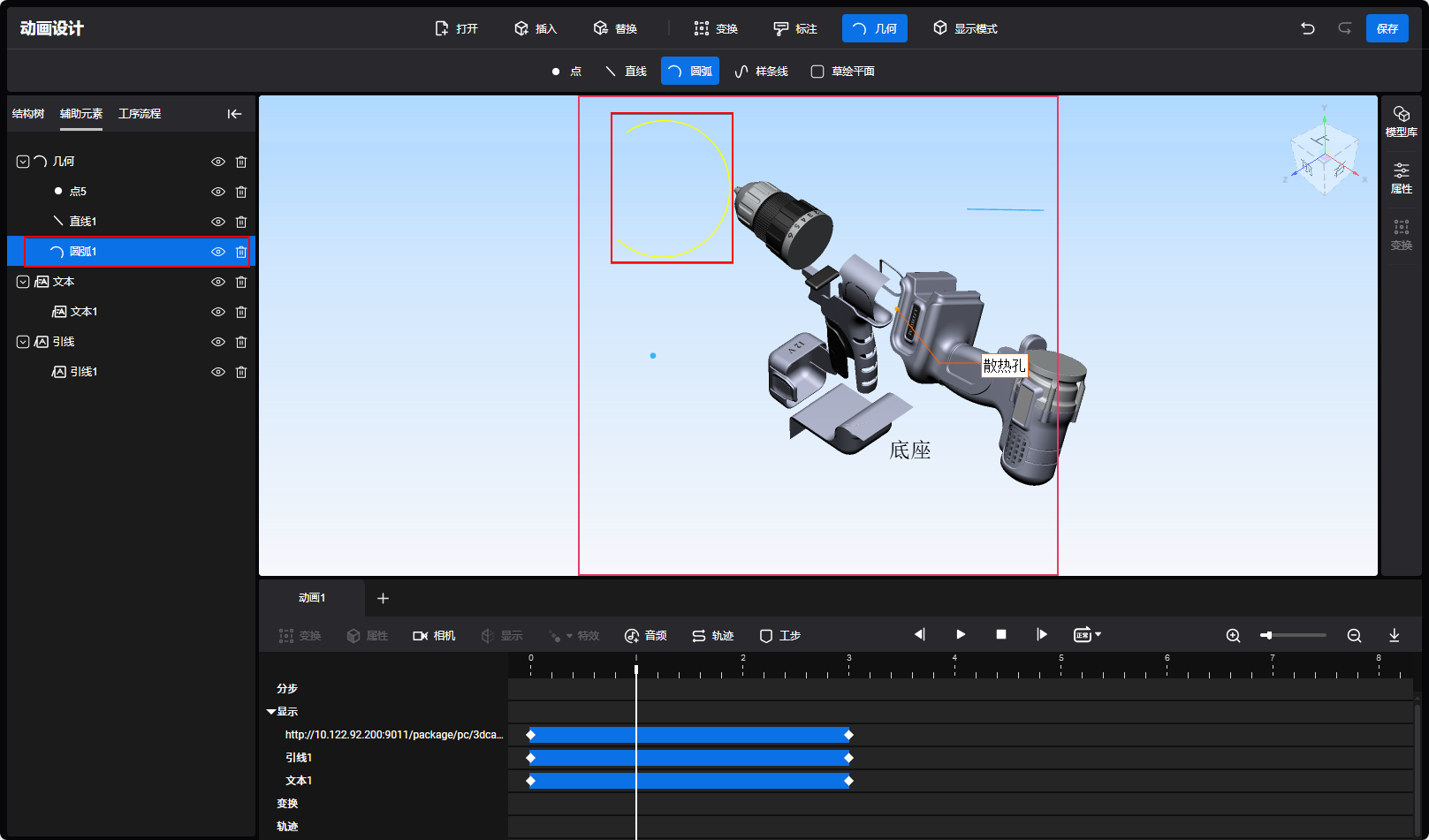 - 轨迹动画即模型根据视图区绘制的几何轨迹移动,支持直线、圆弧、样条线等轨迹操作。