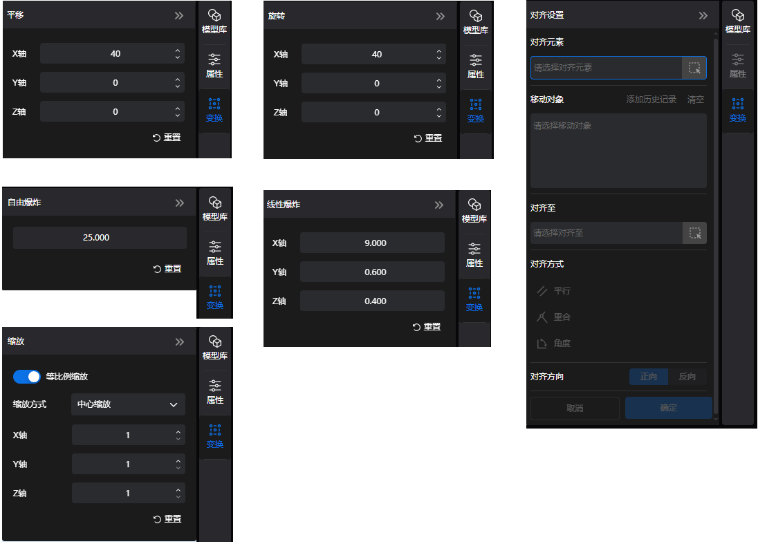 窗格位于视图区域的右侧,是进行模型变换操作时的重要辅助工具。当对模型进行平移、旋转、缩放、爆炸、对齐等变换操作时,
