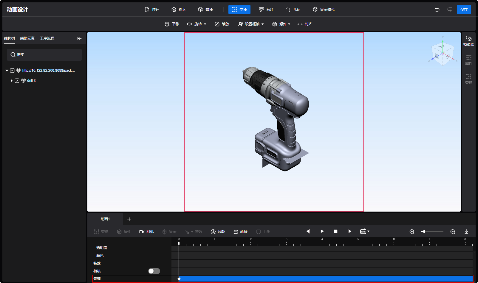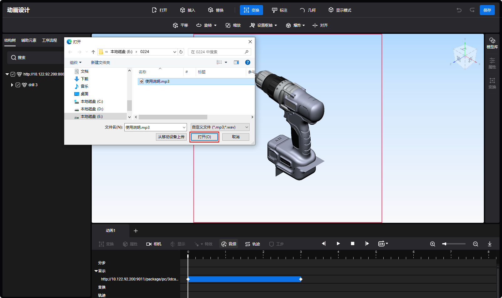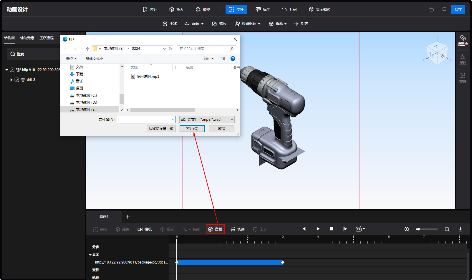 插入音频 功能说明:添加音频,以实现动画与多重音效的同步播放。 操作步骤: 单击时间线区域的音频按钮,浏览器弹出打开文件窗口,如下图。 选择相关音频数据,单击打开,如下图。 音频轨道中新增了一段音频关键帧组,关键帧组的时间长度为音频时间长度,如下图。 单击播放按钮,即可预览音频效果。