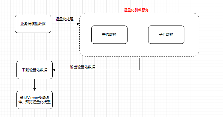 业务端通过轻量化引擎API服务,将数据上传到服务平台,然后调用API服务接口。服务平台将模型数据转换为轻量化数据后,提供轻量化数据压缩包文件和在线预览URL地址给业务端。