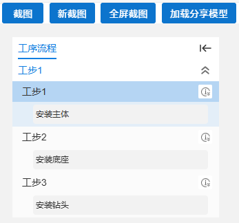 上一步/下一步:此菜单仅当动画中包含工步才显示,用于分步播放动画。Note:在动画设计工具中,可将单个复杂动画拆分为按顺序排列的多个分步动画。在 3D Viewer 中播放此类分步动画时,除了通过控制条的 “上一步 / 下一步” 手动控制外,还可直接通过工序流程列表单击击对应步骤,快速跳转至该分步动画进行播放。