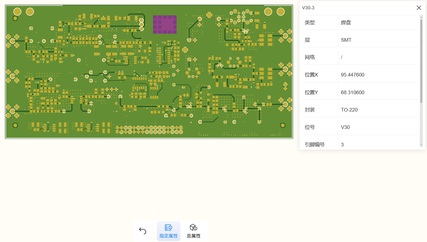 功能:查看整个板图电路板的总属性或指定元器件、线路的属性,包括类型、层、网络、坐标X/Y位置、封装、位号、面积等参数。
