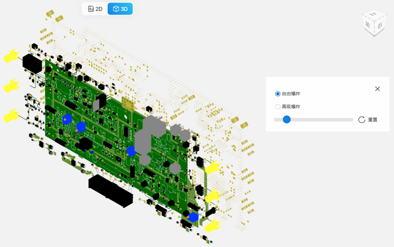 - 自由爆炸:基于模型原始结构自动生成爆炸效果,可快速将电路板各组件分离,适用于快速获取整体结构概览,直观了解元器件、线路和芯片的大致分布及相对位置关系。