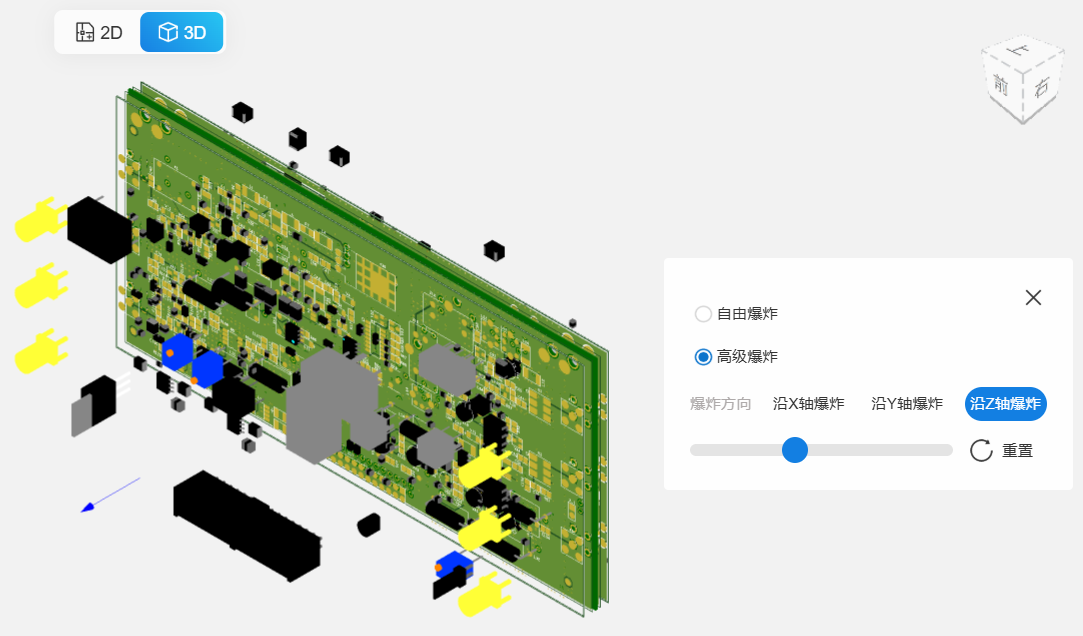 - 高级爆炸:支持手动指定爆炸方向(如沿 X/Y/Z 轴),可精准控制元器件、线路和芯片的分离方向,适用于查看特定视角下的布局细节(如某一轴向上的线路走向与元器件装配关系),提升局部结构的查看精度。