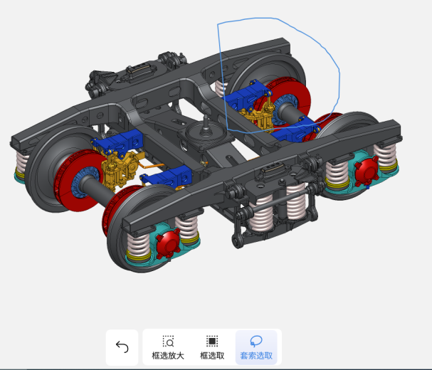 。 - 按住鼠标左键在模型预览区域绘制一个不规则的边界。圈定区域内的零部件自动选中并高亮显示。同时,右下角会实时显示已选零部件的面积和体积信息。