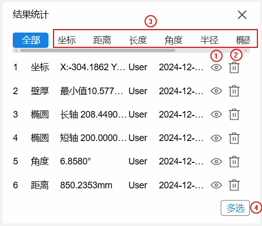 - ④:开启多选多条测量数据。单击一键显隐或一键删除可批量显示/隐藏或删除测量数据。