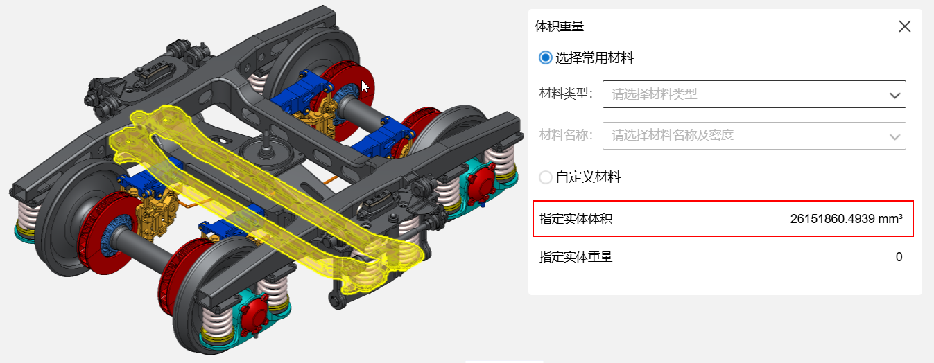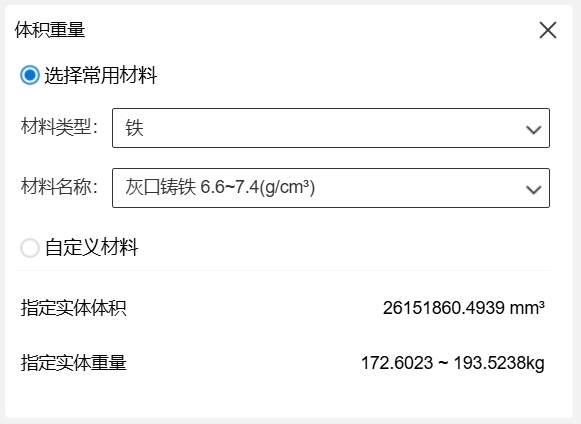 - 选择实体要使用的材料。系统会自动计算重量结果,并显示在下面的对话框中。