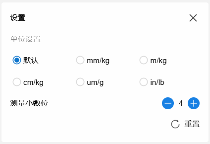 。 - 在设置窗格中,选择测量单位并设定数据保留的小数位。修改单位后,已有测量数据将实时刷新。单击重置可一键恢复系统默认设置。