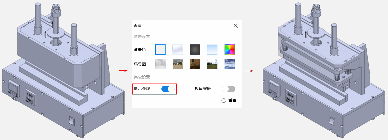 功能: 设置是否开启视角穿透选项。开启后,在当前相机视角下滑动鼠标中键放大模型视图,即可穿透外层实体进入内部,查看内部细节。使用测量功能时,可选中内部零件的点、边、面、体,测量其自身几何信息,或与外部实体间的几何数据。