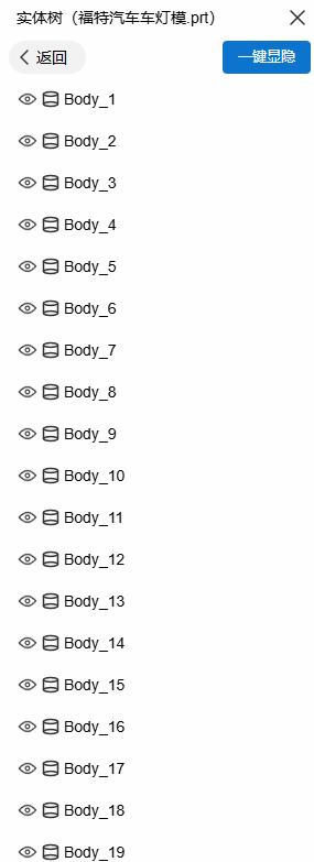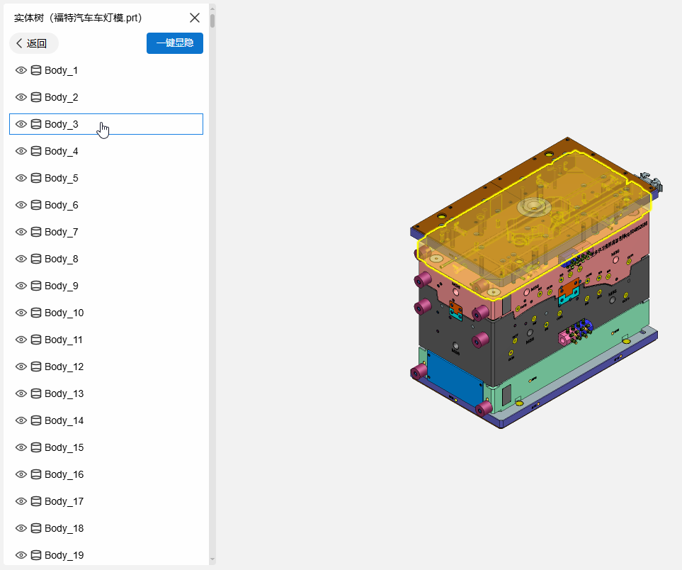 - 在实体树中,单击任意一个实体(Body)节点,该实体将在预览区域高亮显示。按住Ctrl