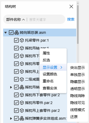 - 选中零部件节点,然后单击鼠标右键可查看此零部件的属性、设置显示设置、重命名等。