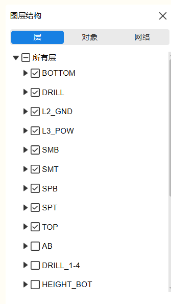 - 层选项卡:按板图的物理分层(如顶层、底层、电源层、接地层等)展示结构,每层包含该层上的所有设计元素。