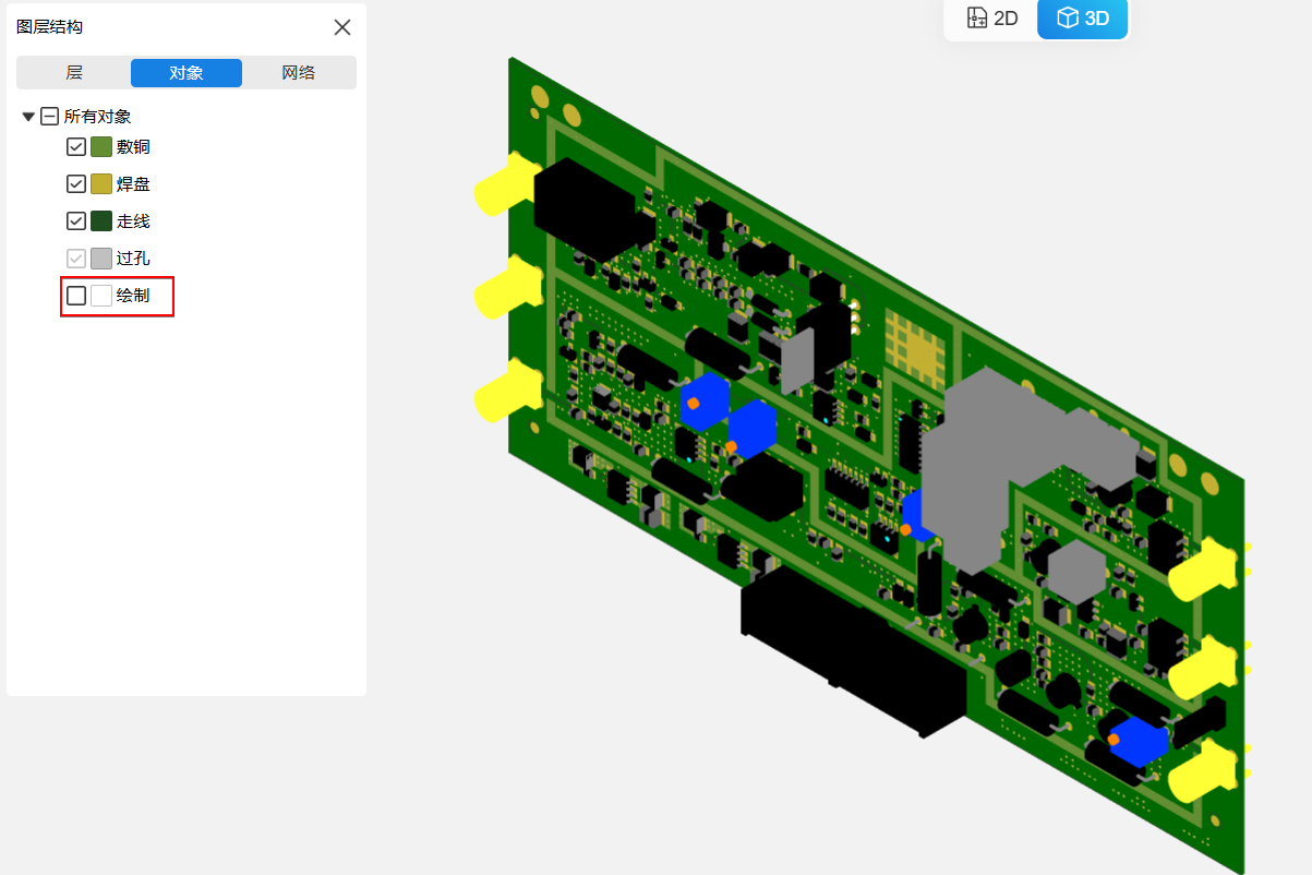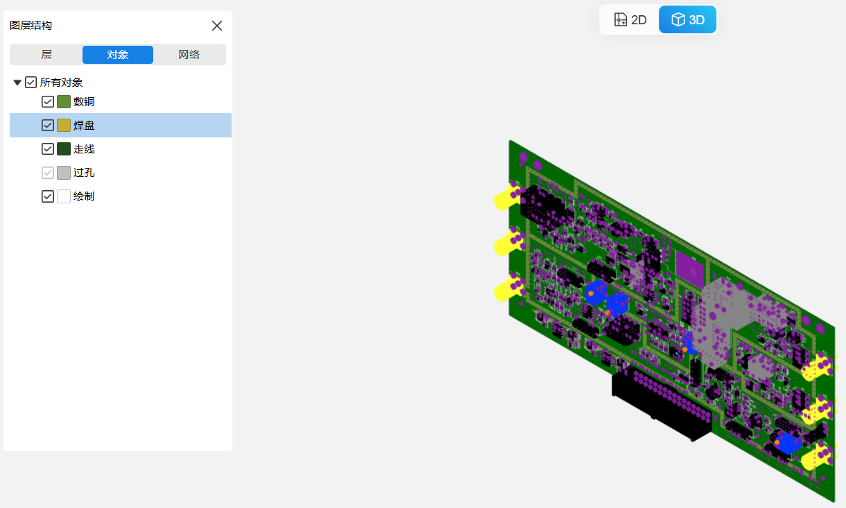 功能:提供从 层、对象、和网络三个核心维度来查看板图文件3D模型设计细节,并可灵活设置各维度下元器件的显示或隐藏状态。
