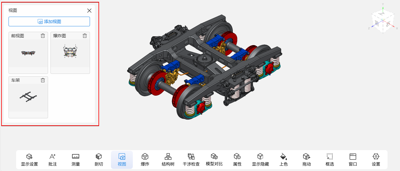 视图会记录当前模型视角、模型位置、零部件显隐状态、显示设置、批注内容、测量结果、剖切/爆炸状态等信息,单击视图列表中的任意视图,可将模型还原至视图保存时的状态。