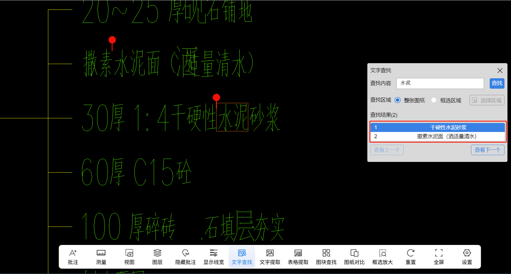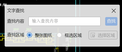 文字查找 功能:使用关键词对图纸中上的文本内容进行搜索和定位。 操作步骤: 单击。 在文字查找对话框中,输入要查找的关键词。 Tip: 默认在整张图纸查找,若要在指定的区域进行查找,选择框选区域,单击选择区域,然后使用鼠标进行框选。 单击查找。搜索结果显示在列表中,同时图纸预览区域自动红色框选高亮并放大显示第一个匹配的结果。 单击列表中的行查看对应的搜索结果。也可以单击查看下一个逐个查看搜索到的结果。