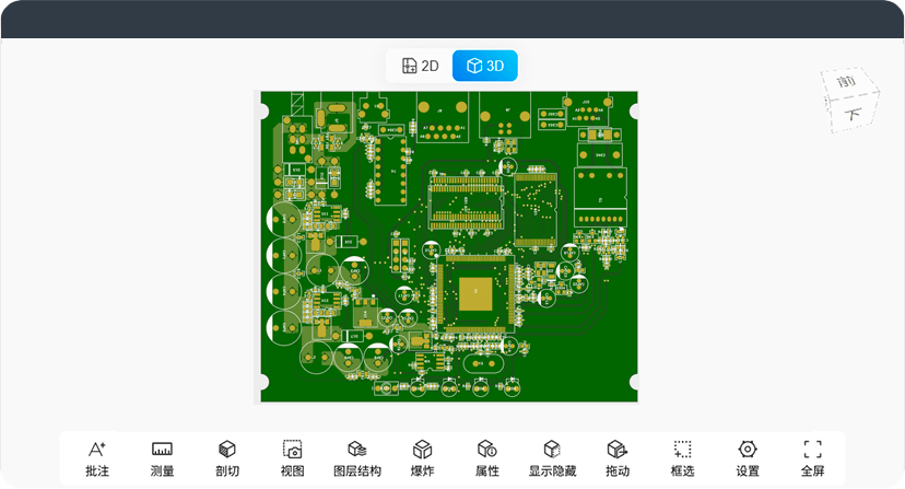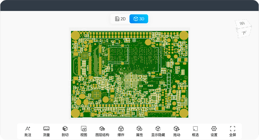支持PCB板图在2D/3D视角下显示,支持多板设计在不同PCB板之间切换查看,提供强大的交互功能,包括:平移、缩放、批注、测量、视图、图层结构、属性等。